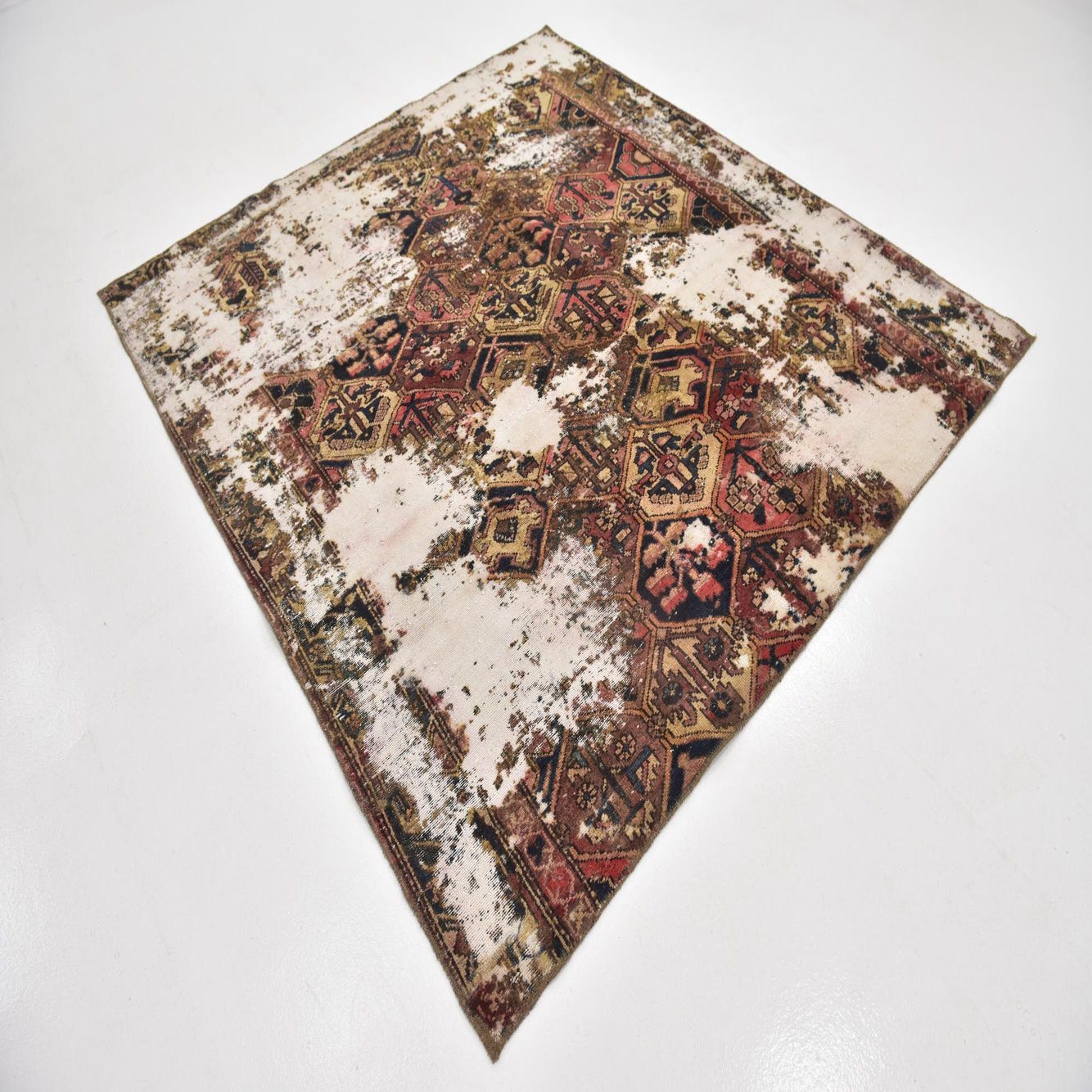This Persian Ultra Vintage rug is an antique Persian Rug that has been washed, over-dyed, and then shaved down to a low pile. Look at the detail pictures to fully appreciate the uniqueness of this piece.