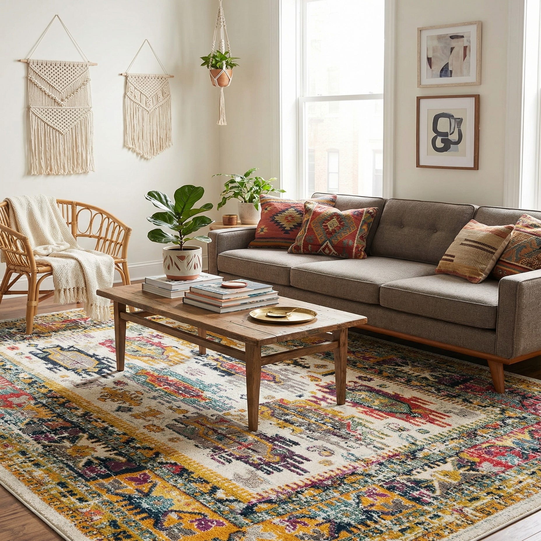 Primary color is Ivory. Colors in this rug include: Ivory, Black, Blue, Gray, Green, Light Blue, Orange, Red, Yellow.