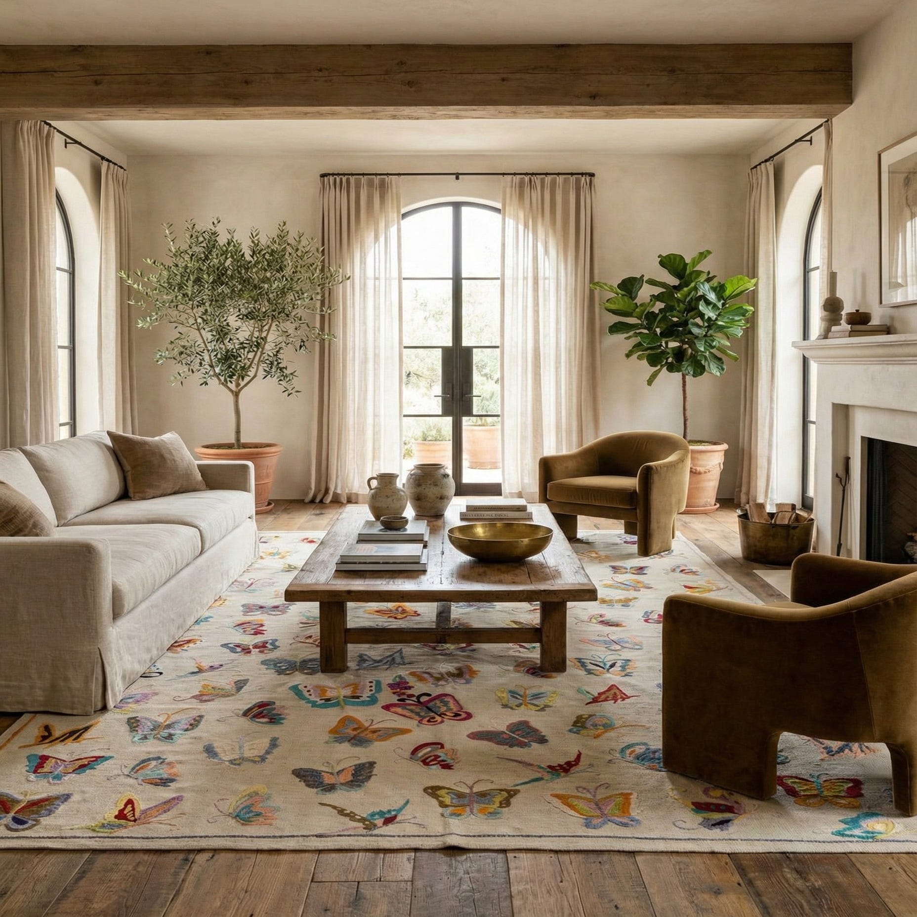 Primary color is Ivory. Colors in this rug include: Ivory, Beige, Brown, Black, Blue, Light Blue, Light Brown, Light Green, Light Salmon, Olive, Orange, Red, Rust Red, Gold, Gray, Green, Yellow.