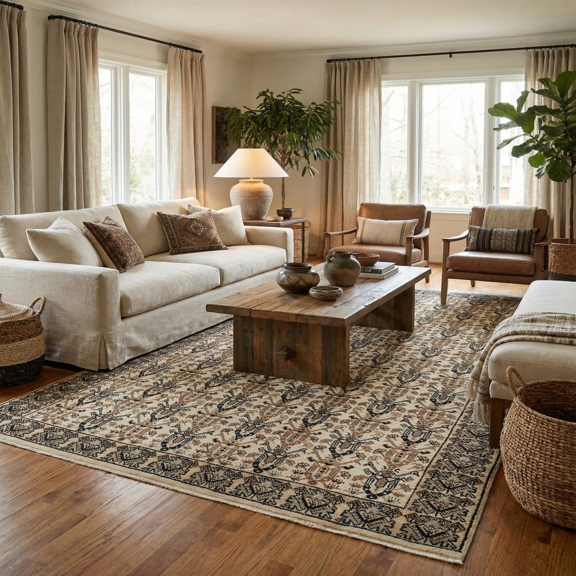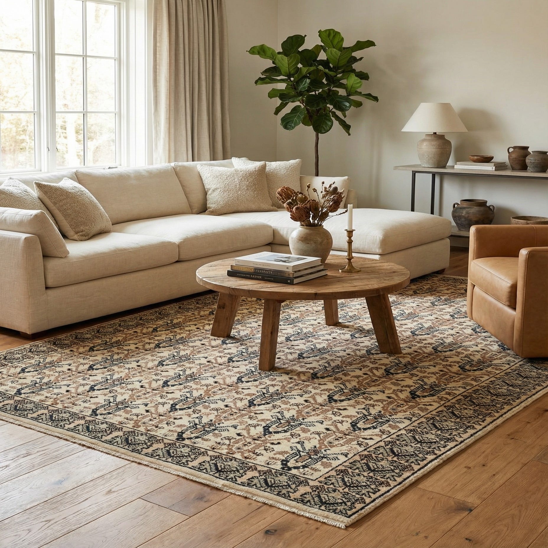 Primary color is Ivory. Colors in this rug include: Ivory, Black, Light Brown, Gray, Beige.