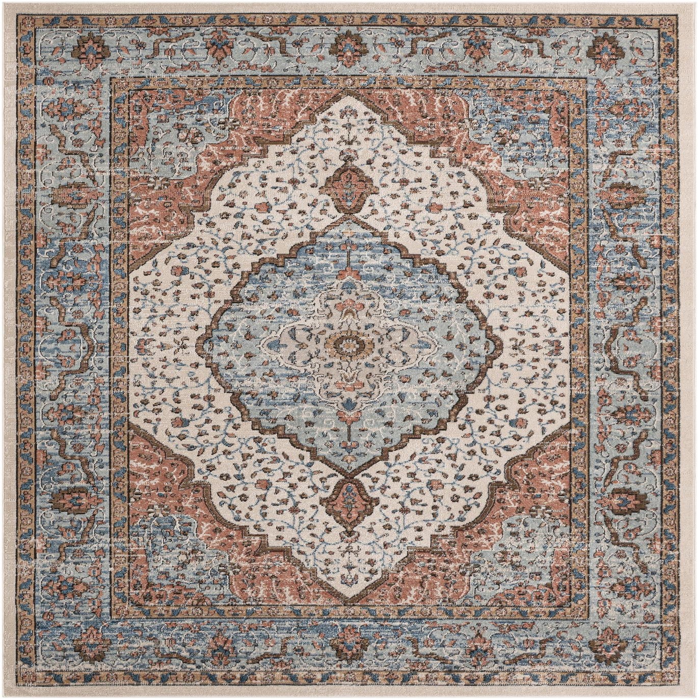 Primary color is Ivory. Colors in this rug include: Ivory, Blue, Brown, Light Blue, Rust Red.