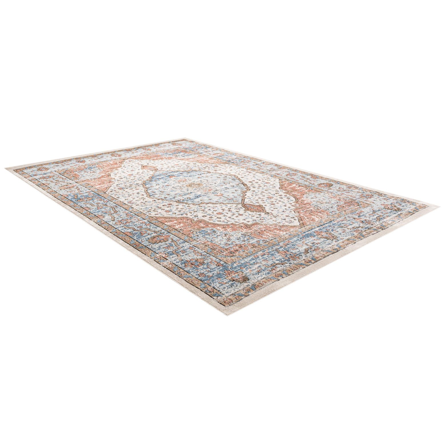 Primary color is Ivory. Colors in this rug include: Ivory, Blue, Brown, Light Blue, Rust Red.