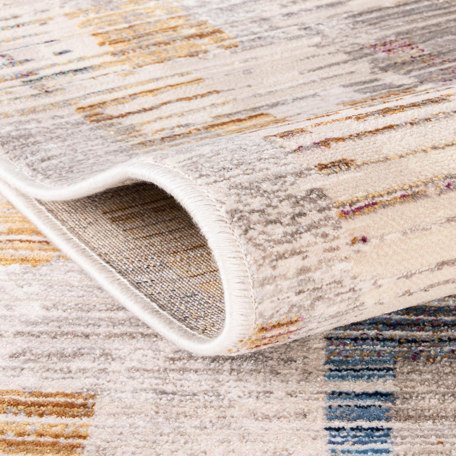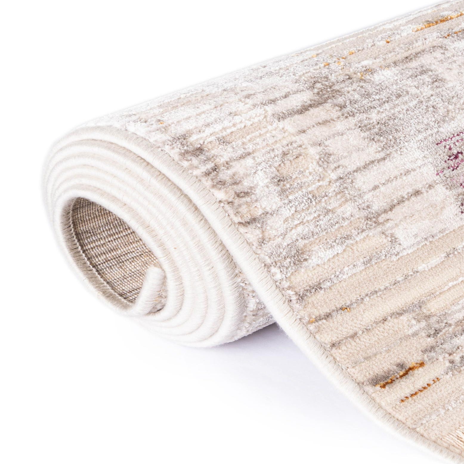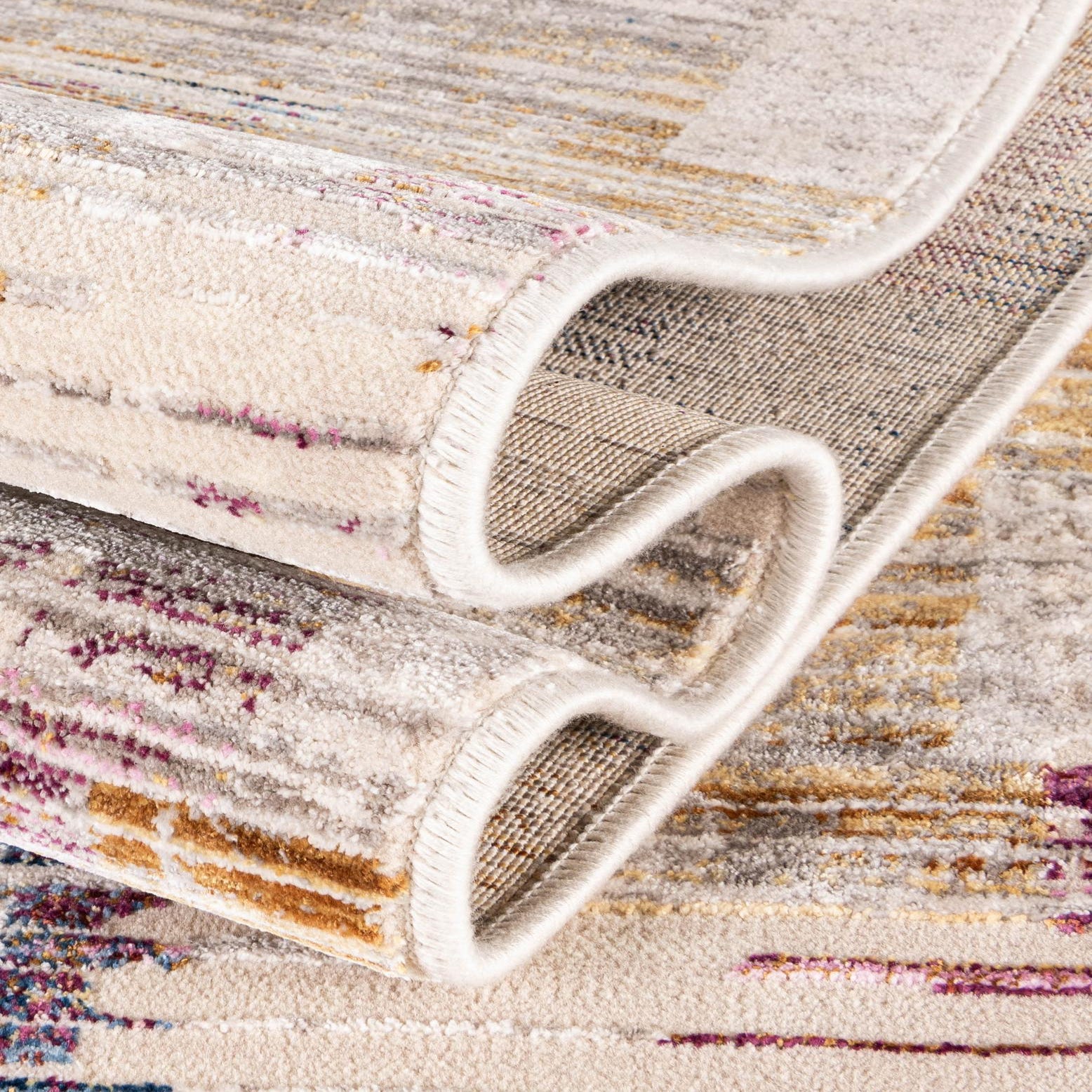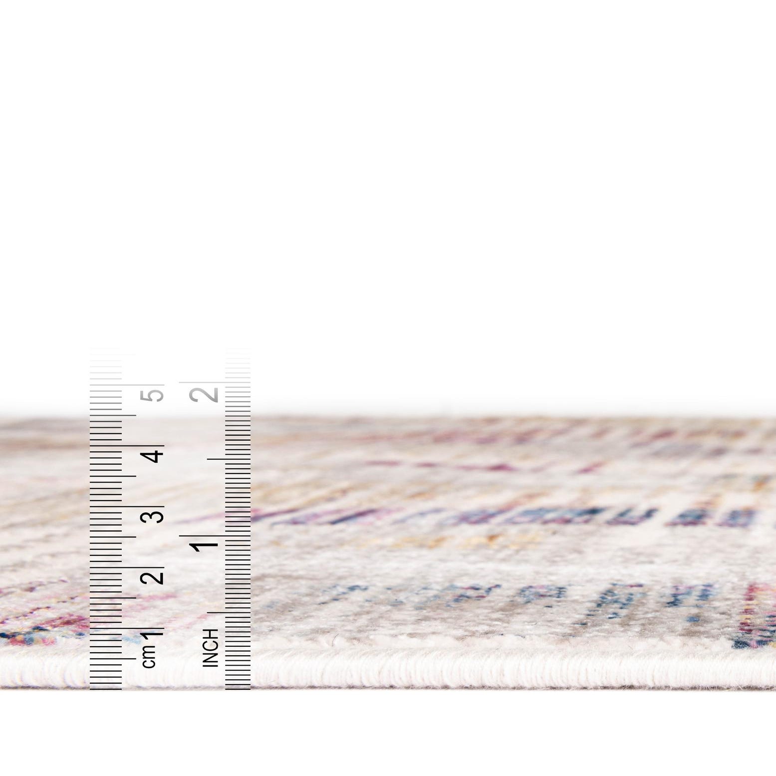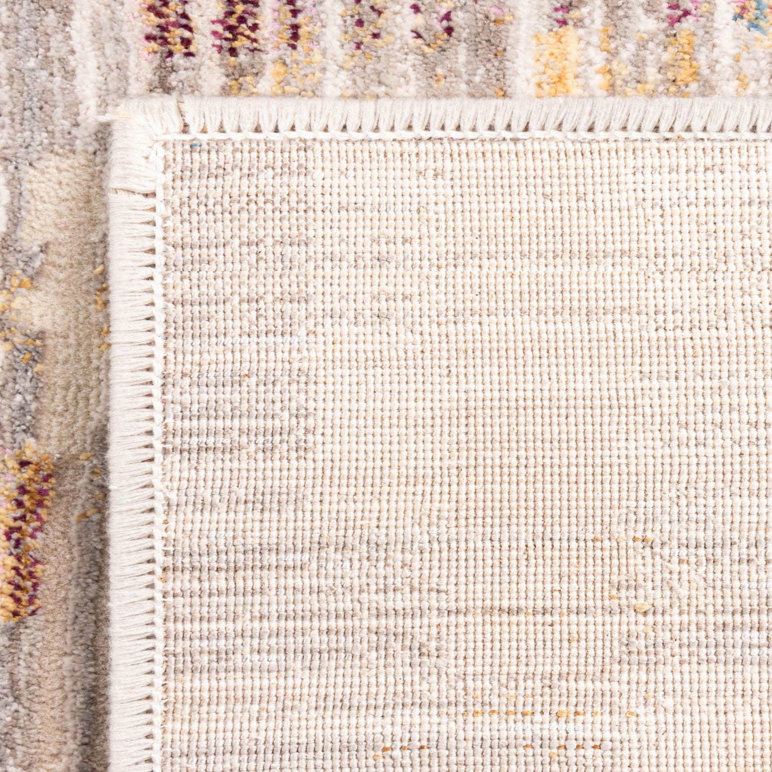 Primary color is Ivory. Colors in this rug include: Ivory, Beige, Blue, Gold, Light Brown, Purple.