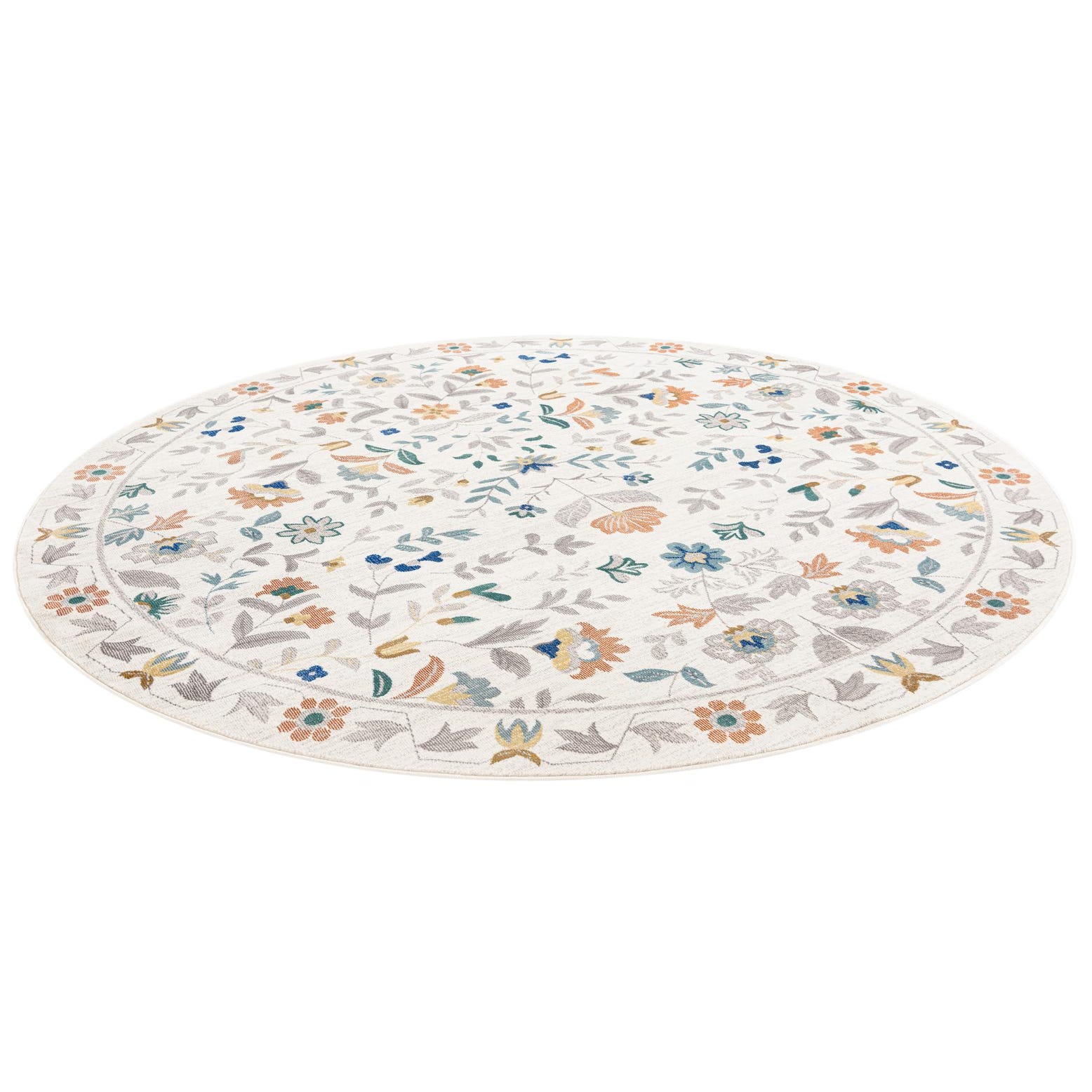 Primary color is Ivory. Colors in this rug include: Ivory, Blue, Gray, Green, Rust Red, Yellow.