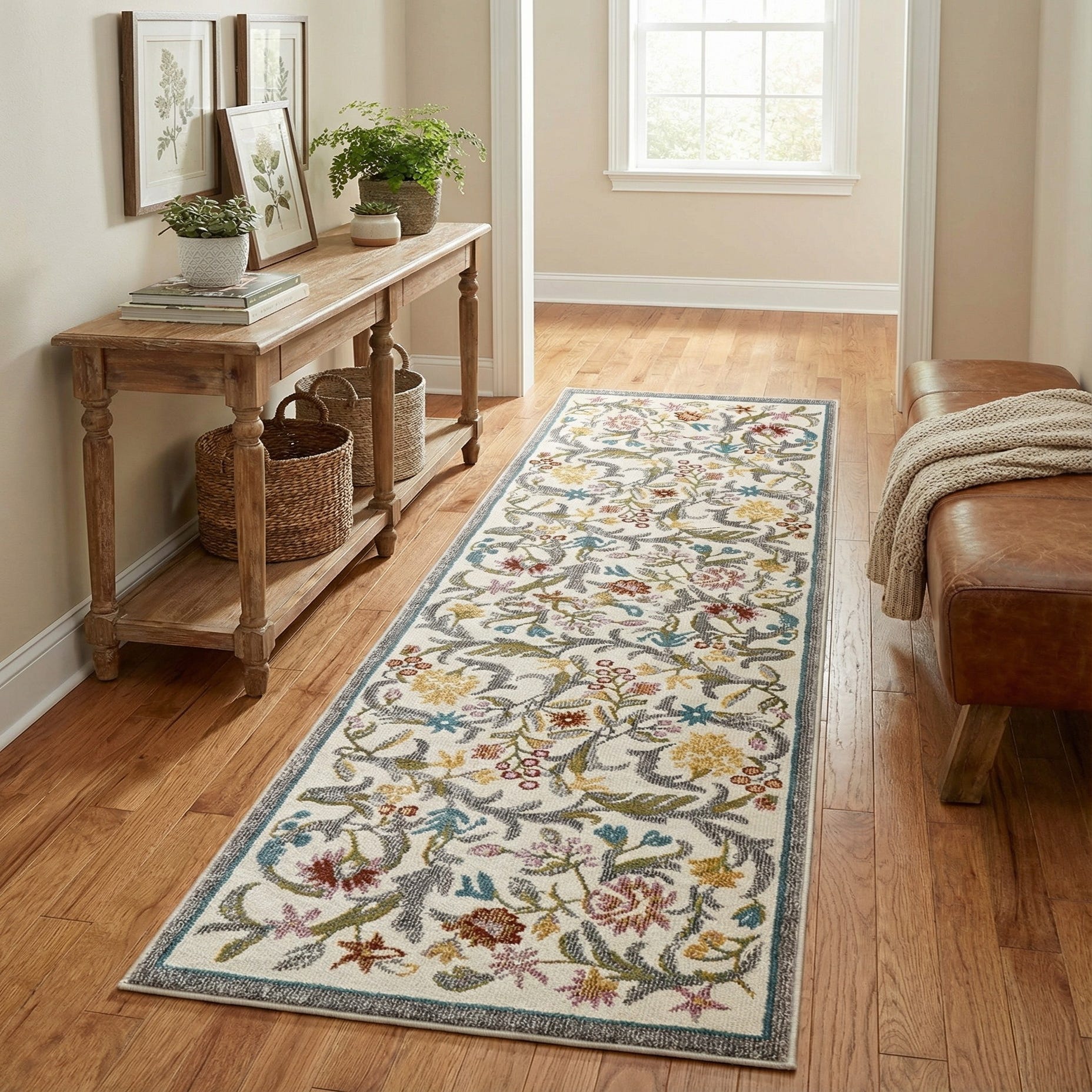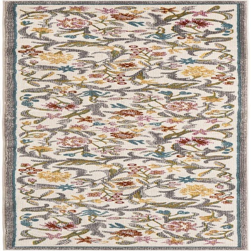 Primary color is Ivory. Colors in this rug include: Ivory, Blue, Burgundy, Gray, Green, Light Brown, Yellow, Pink.
