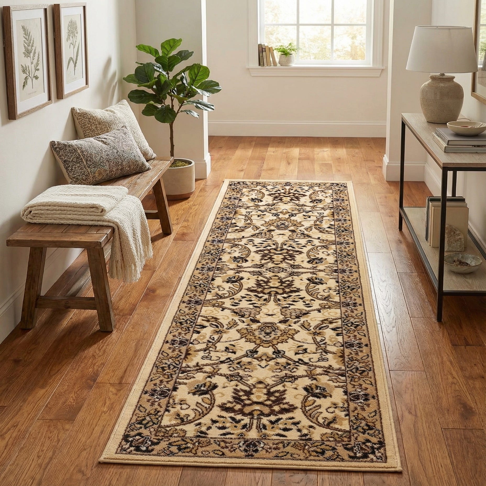 Primary color is Ivory. Colors in this rug include: Ivory, Beige, Black, Brown, Cream, Tan.