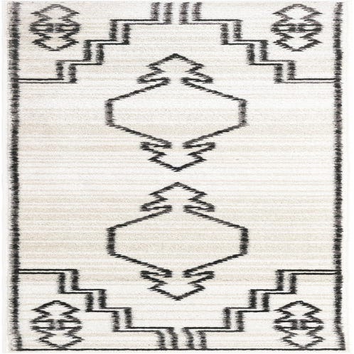 Primary color is Ivory. Colors in this rug include: Ivory, Black, Gray.