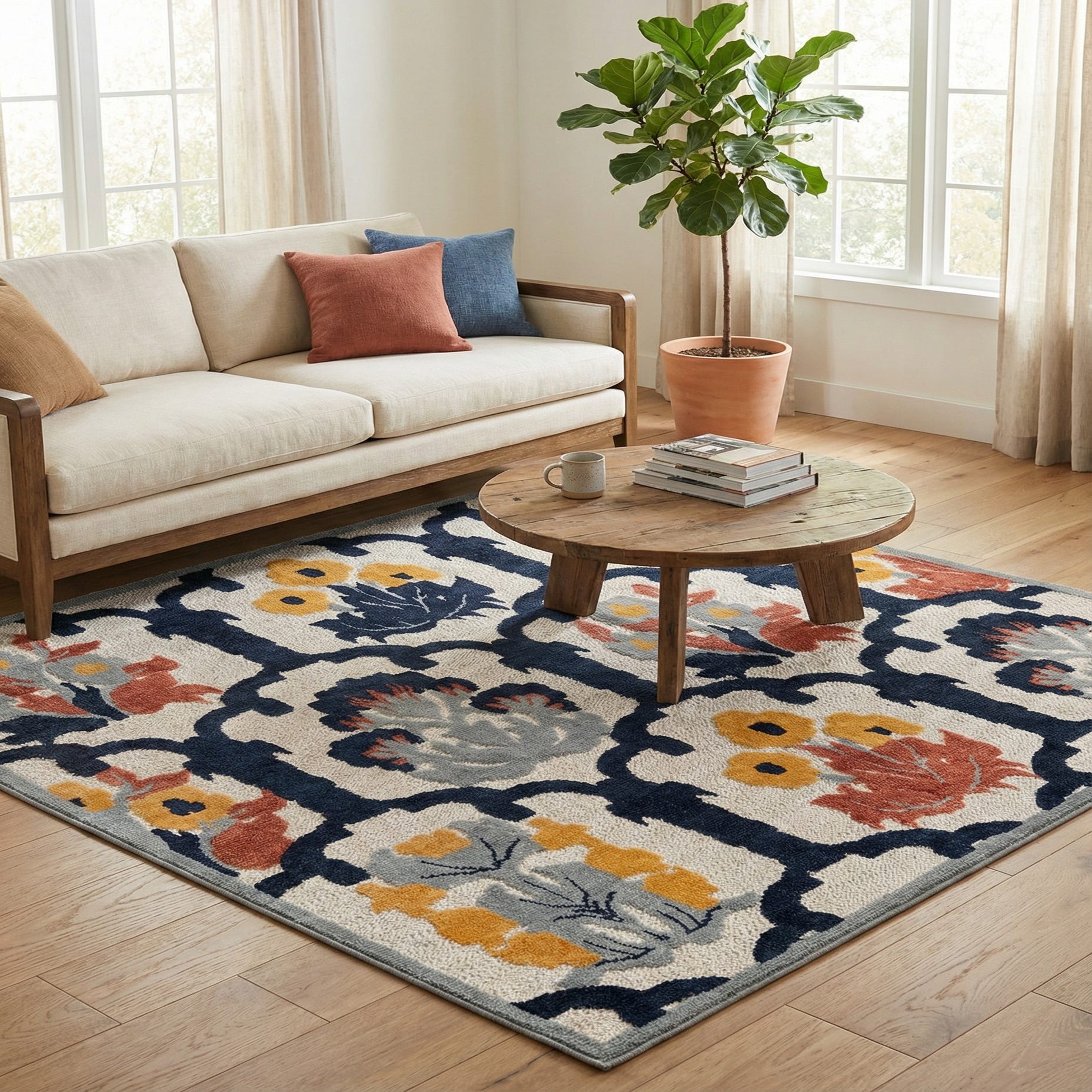 Primary color is Ivory. Colors in this rug include: Ivory, Light Blue, Navy Blue, Yellow, Pink.