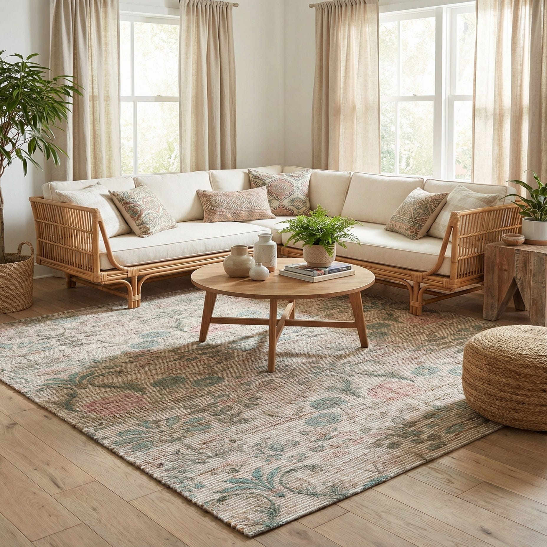 Primary color is Ivory. Colors in this rug include: Ivory, Blue, Brown, Navy Blue, Pink, Green.