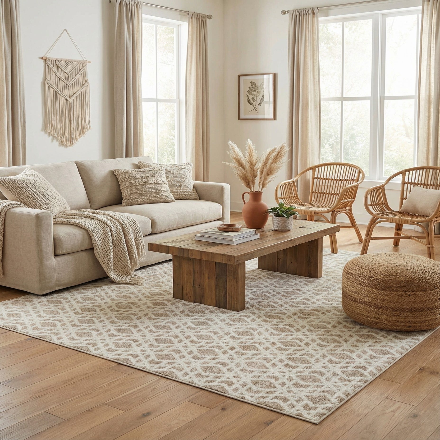 Primary color is Ivory. Colors in this rug include: Ivory, Beige, Light Brown.