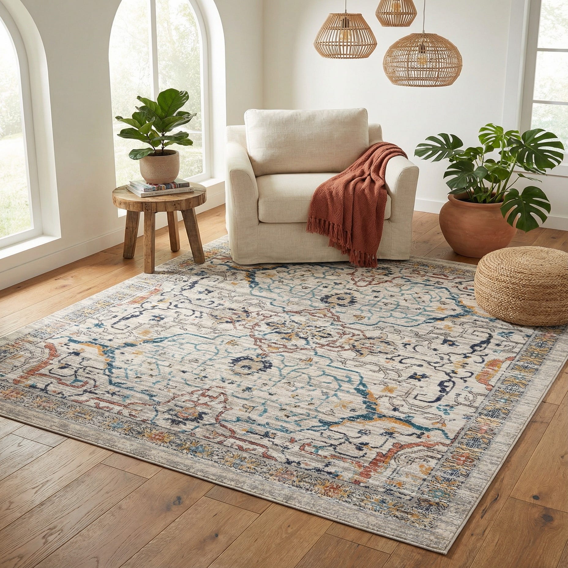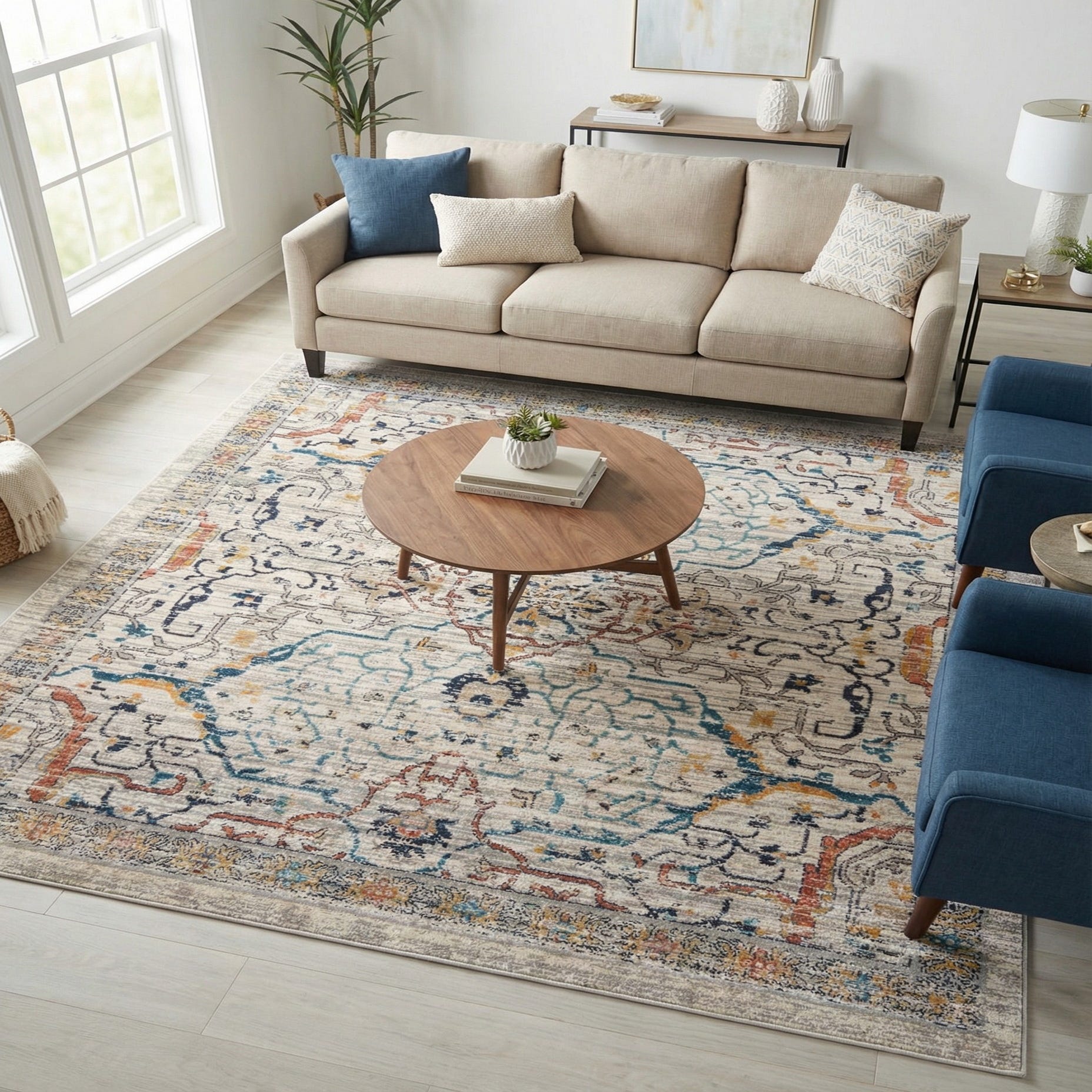 Primary color is Ivory. Colors in this rug include: Ivory, Blue, Navy Blue, Rust Red, Terracotta, Light Blue, Light Brown.