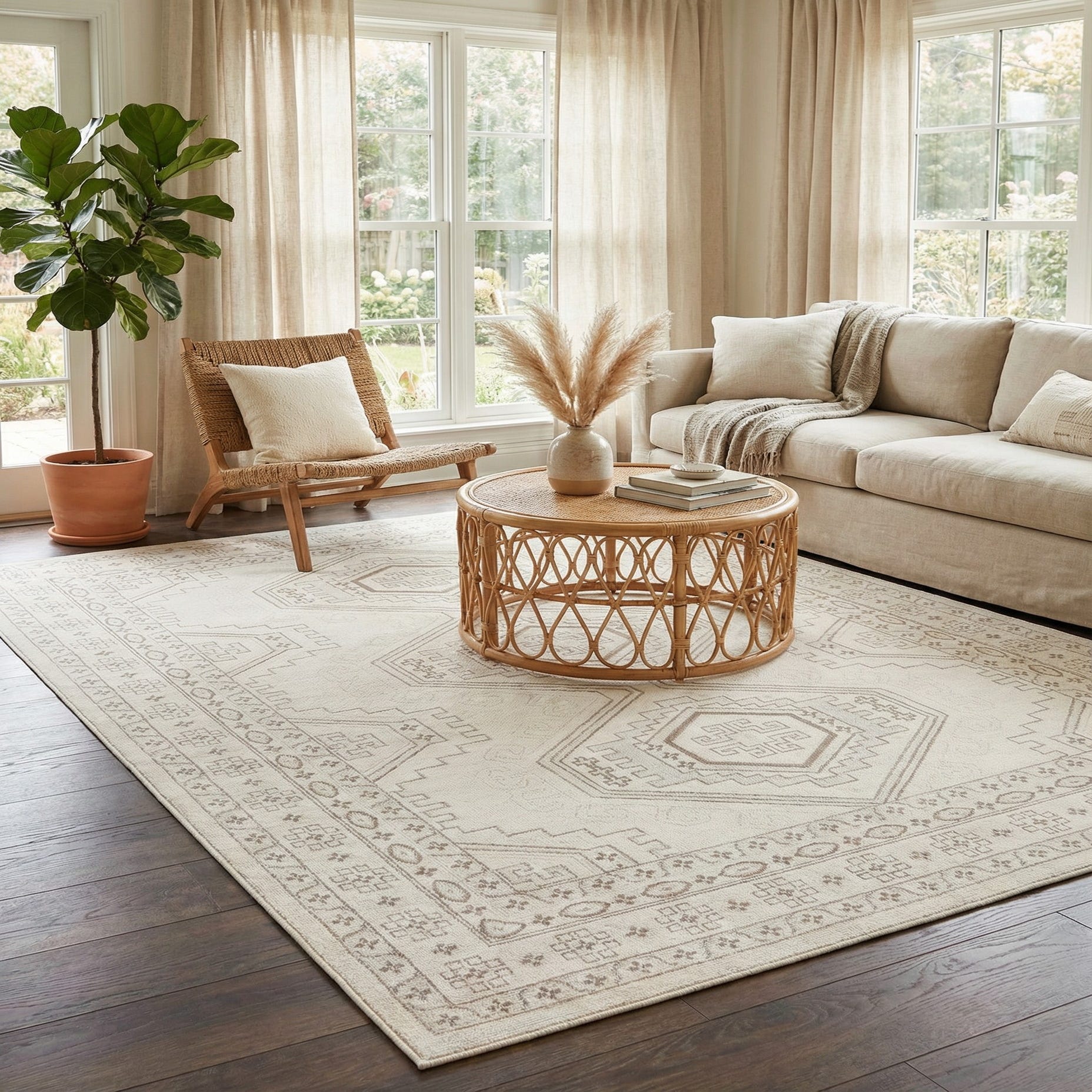 Primary color is Ivory. Colors in this rug include: Ivory, Light Brown, Gray.
