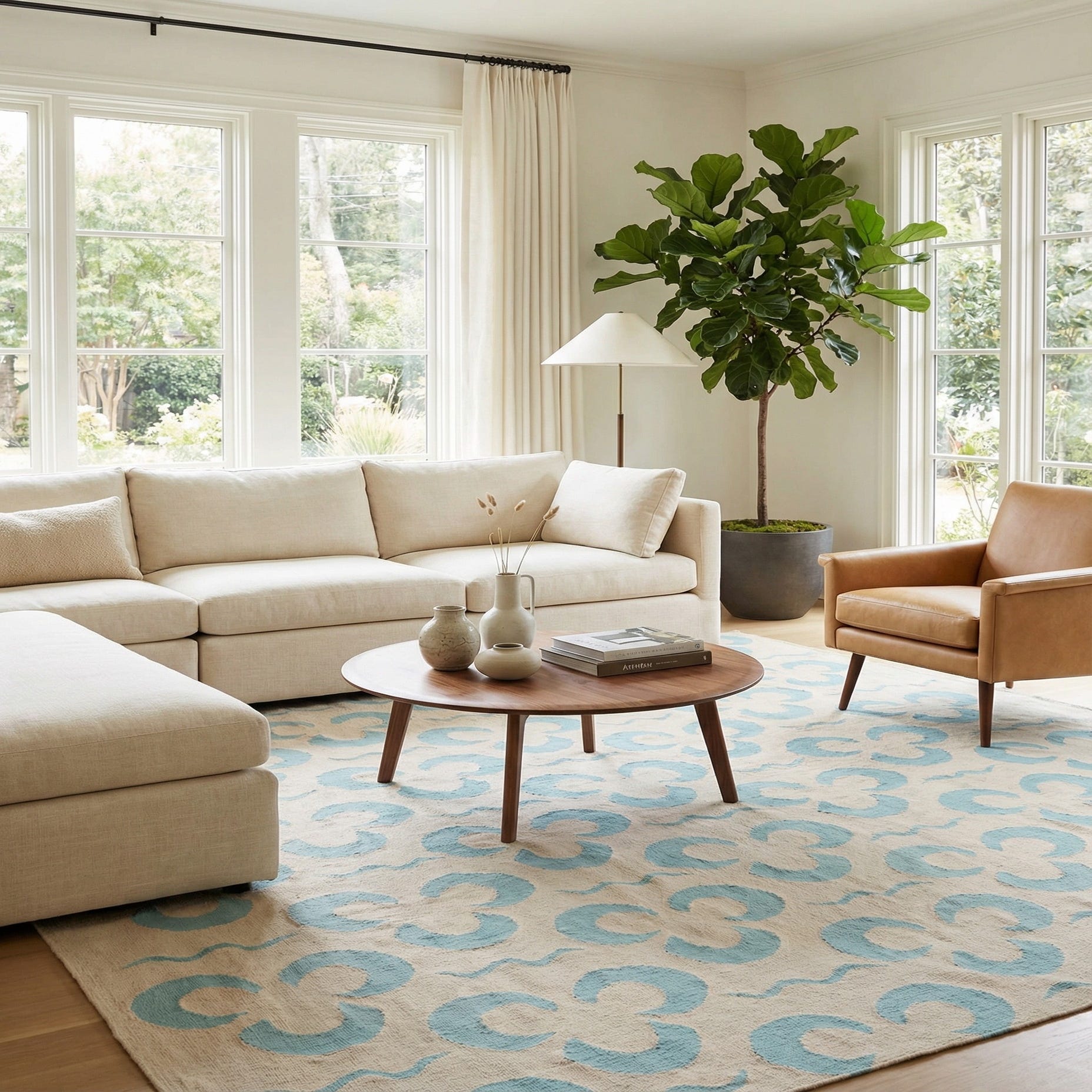 Primary color is Ivory. Colors in this rug include: Ivory, Light Blue.