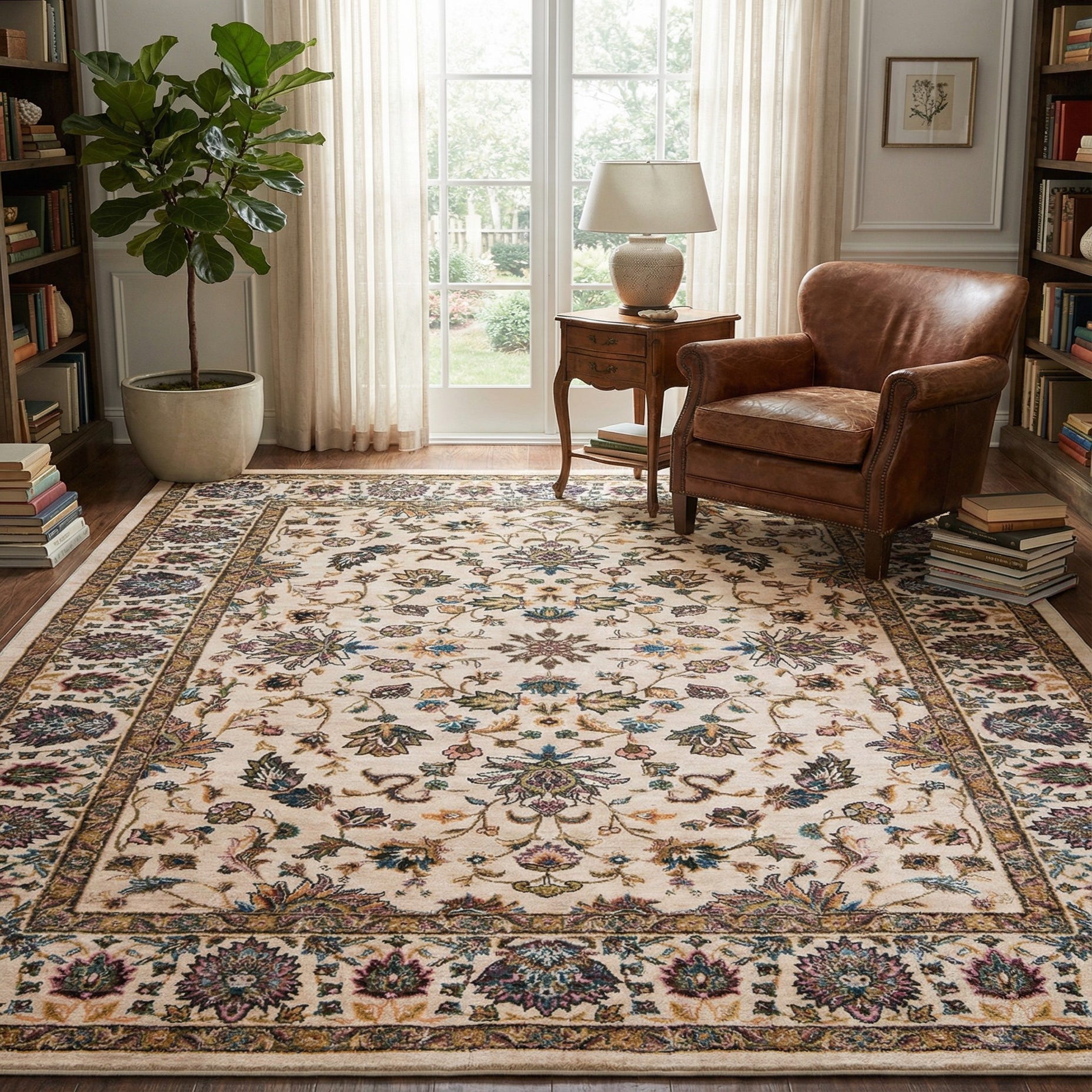 Primary color is Ivory. Colors in this rug include: Ivory, Beige, Blue, Brown, Pink, Olive, Yellow.
