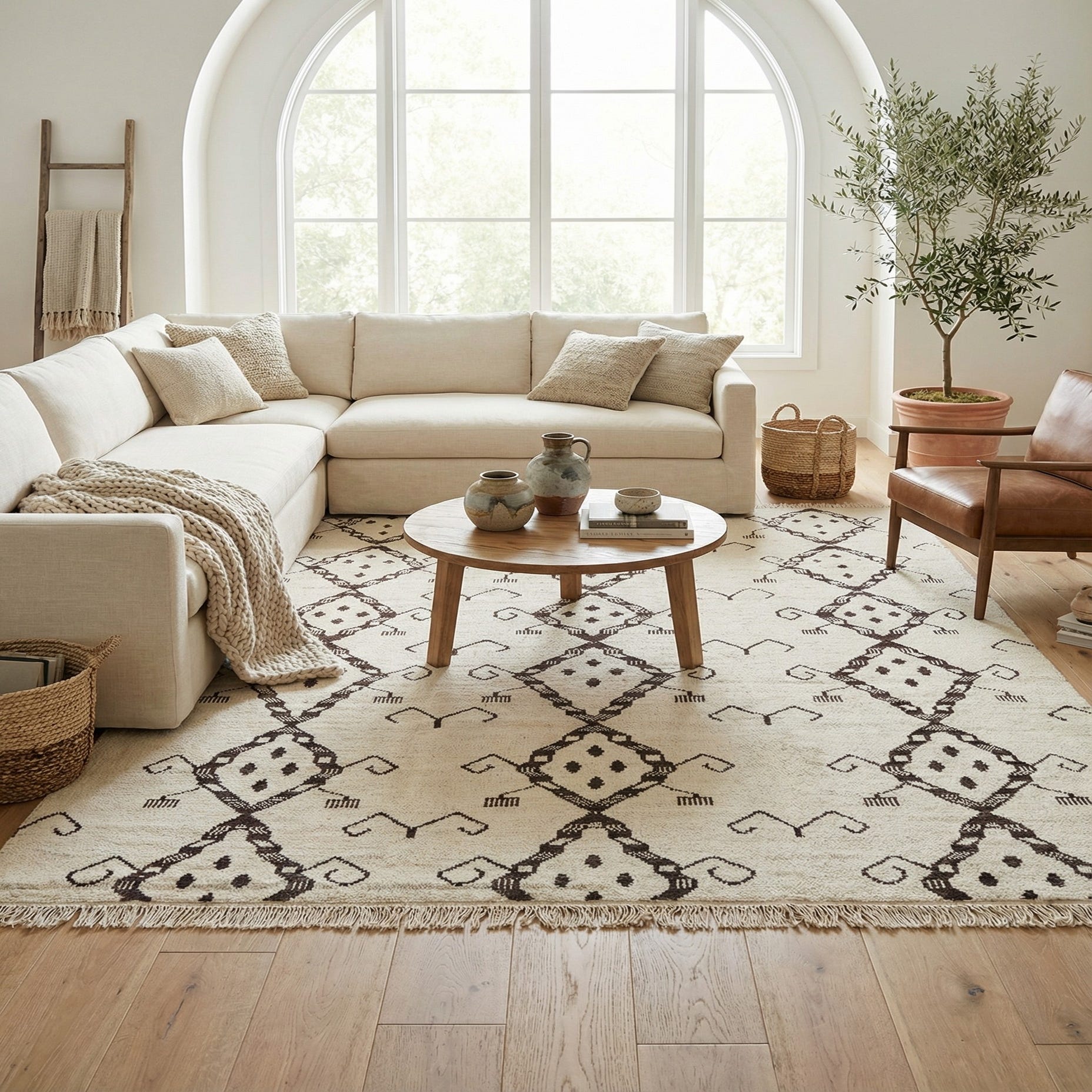 Primary color is Ivory. Colors in this rug include: Ivory, Black.