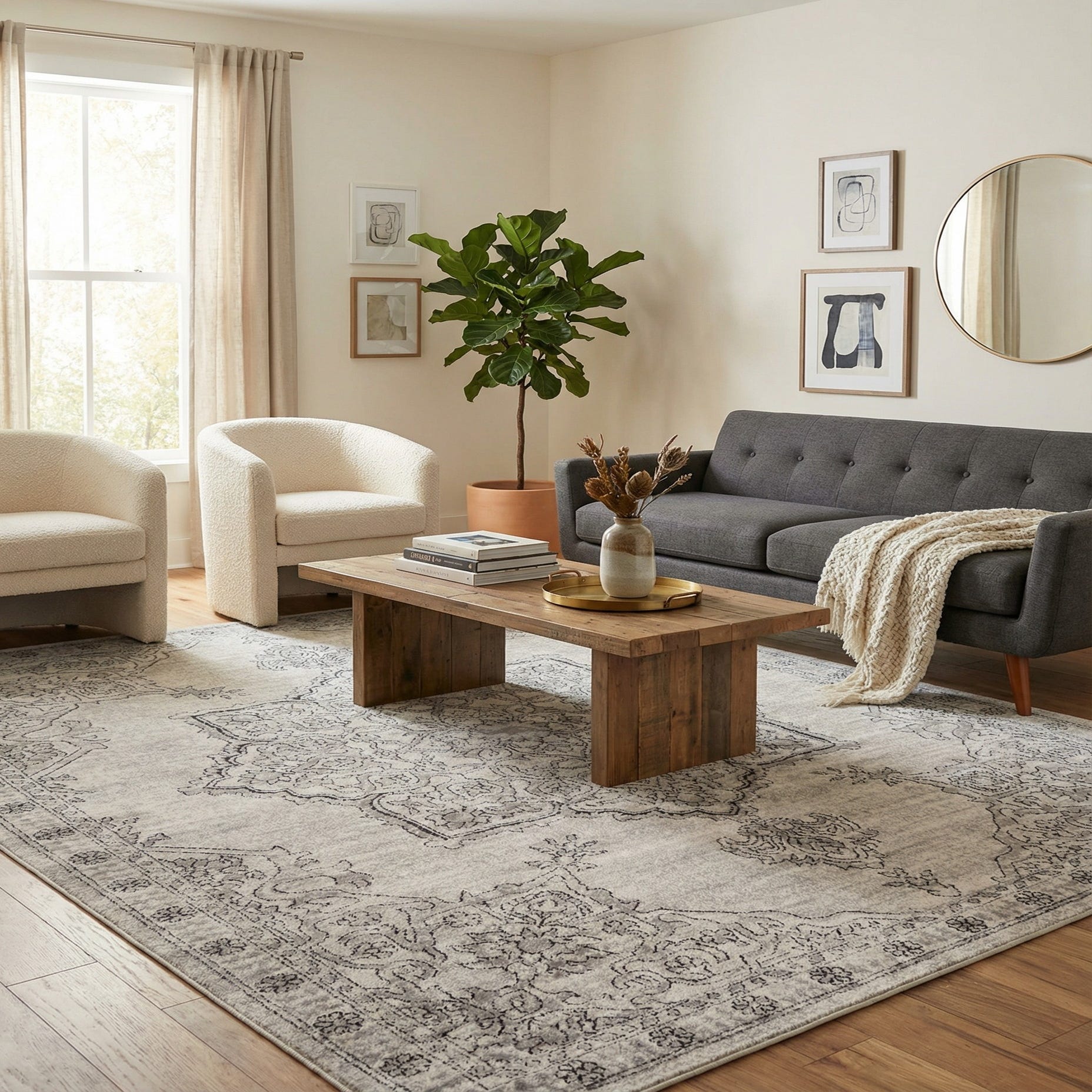 Primary color is Ivory. Colors in this rug include: Ivory, Black, Gray.