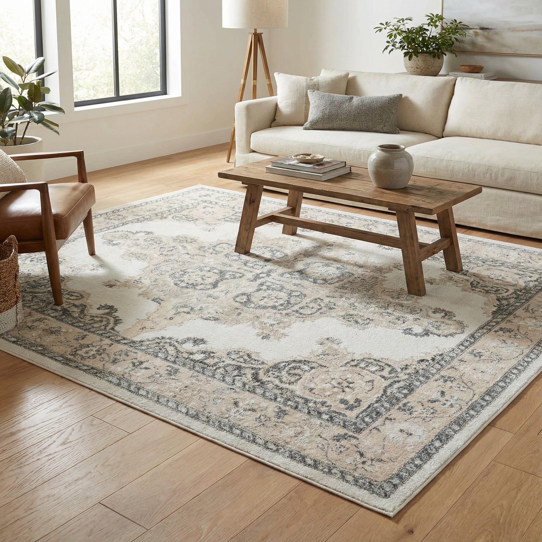 Primary color is Ivory. Colors in this rug include: Ivory, Beige, Gray.