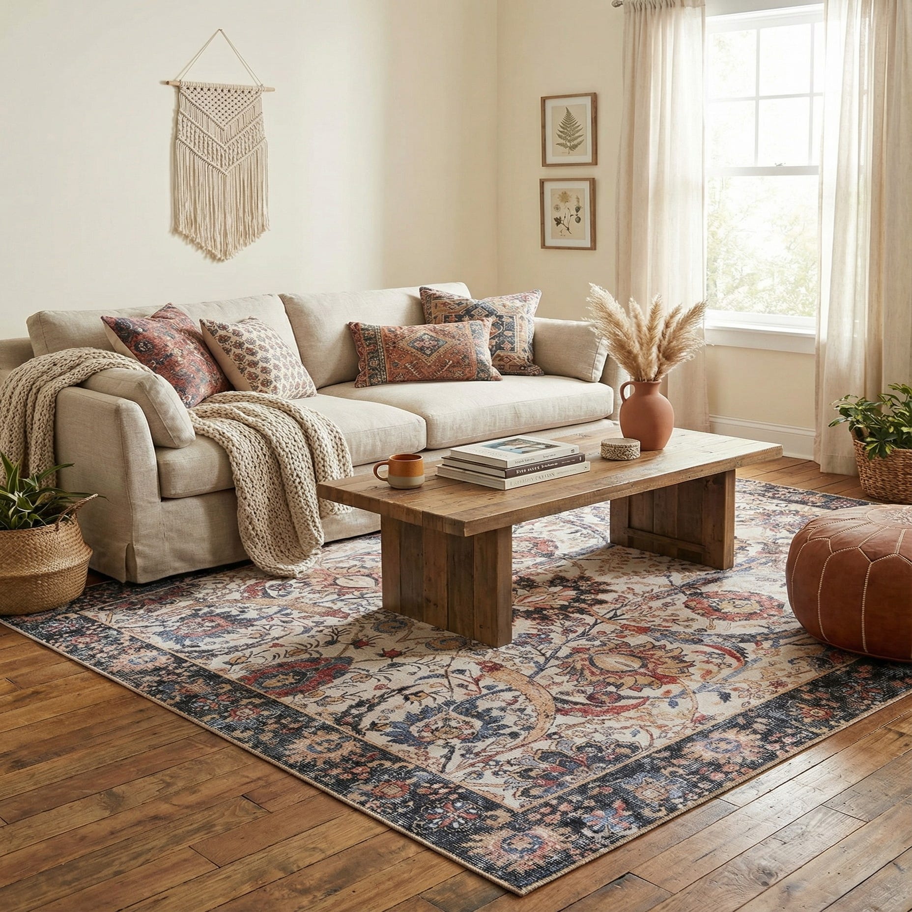 Primary color is Ivory. Colors in this rug include: Ivory, Beige, Black, Blue, Brown, Red.