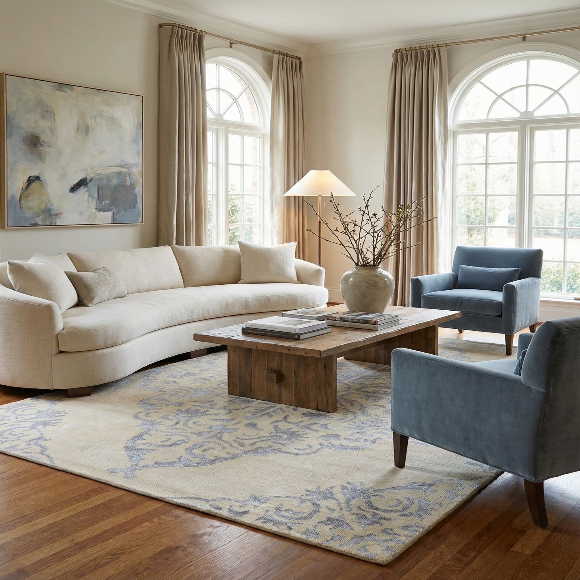 Primary color is Ivory. Colors in this rug include: Ivory, Silver.
