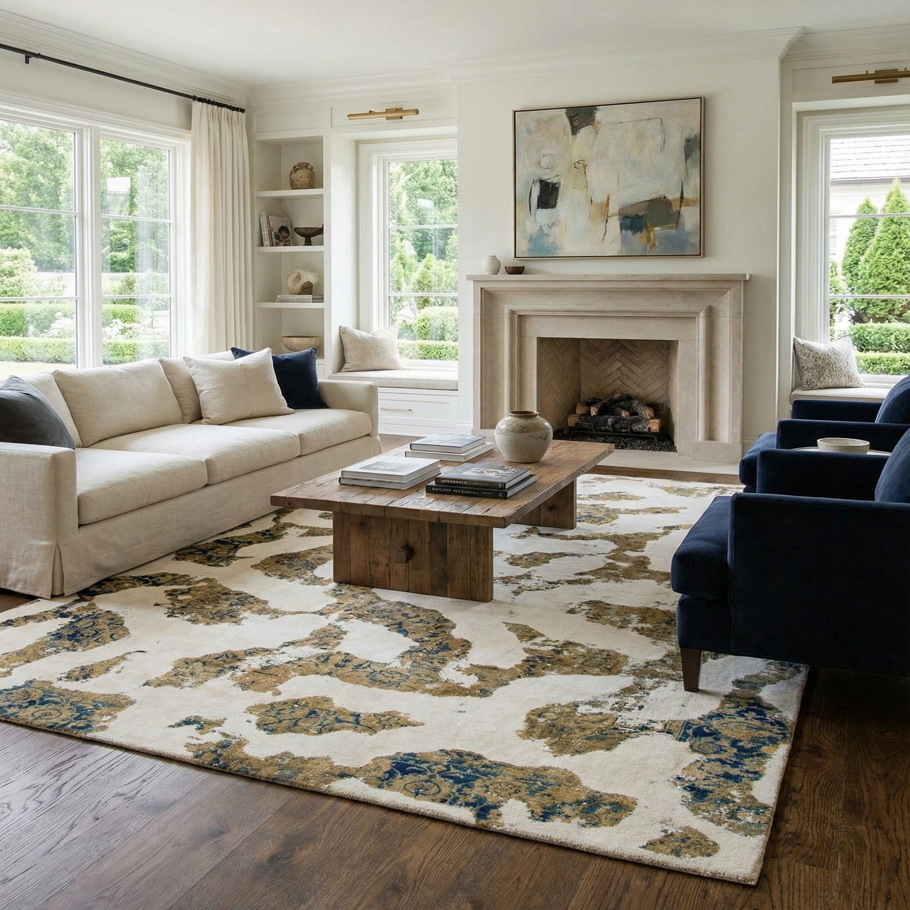 Primary color is Ivory. Colors in this rug include: Ivory, Beige, Tan, Navy Blue, Green.
