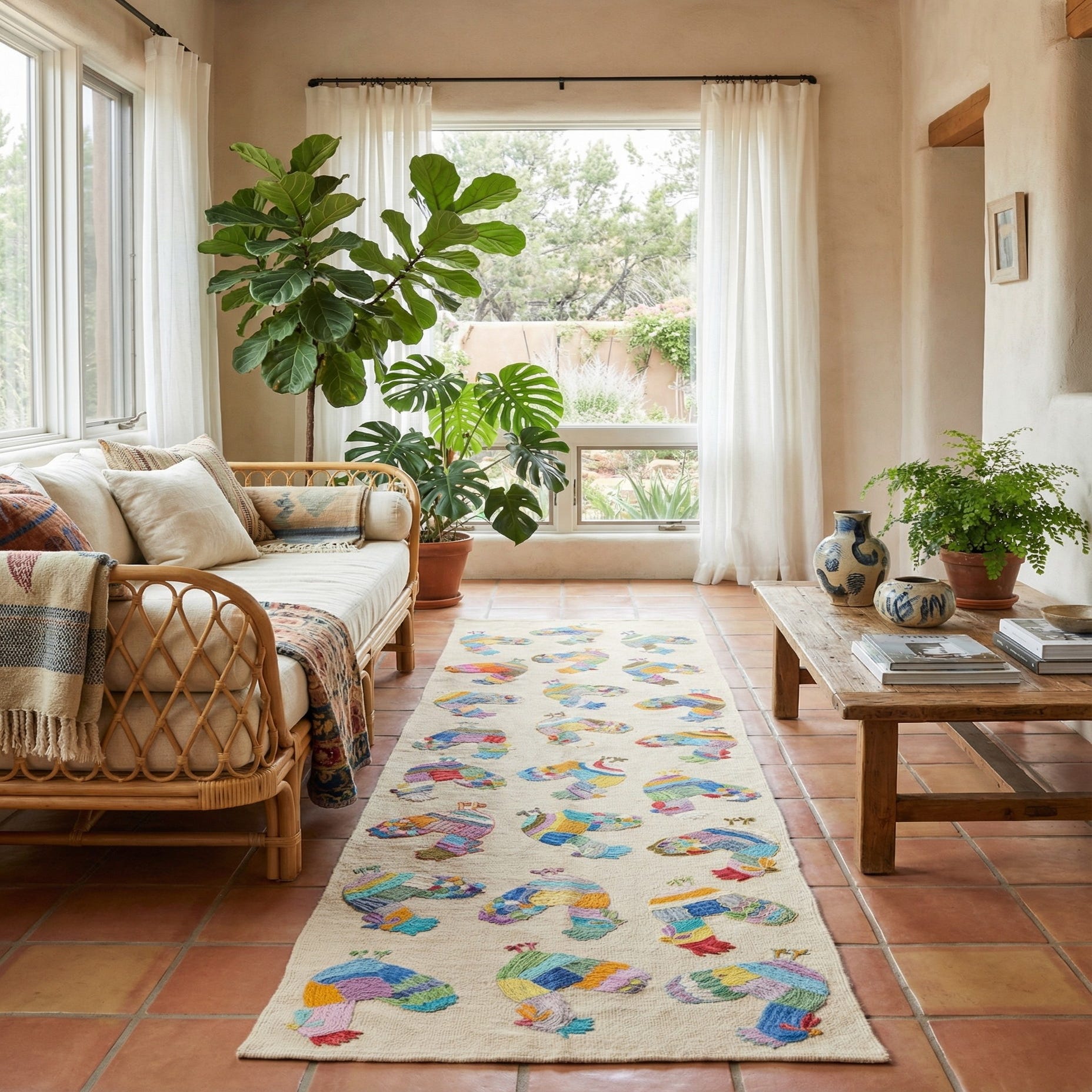 Primary color is Ivory. Colors in this rug include: Ivory, Gray, Navy Blue, Olive, Red, Yellow, Violet, Light Blue.