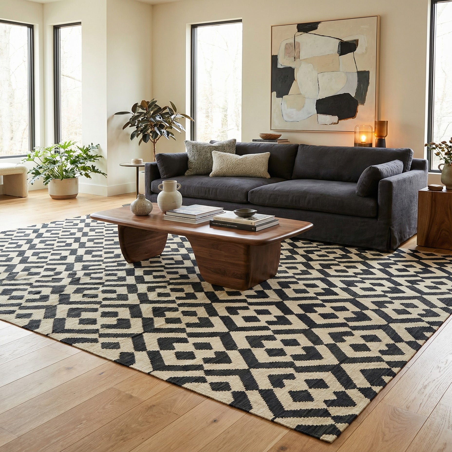 Primary color is Ivory. Colors in this rug include: Ivory, Black.