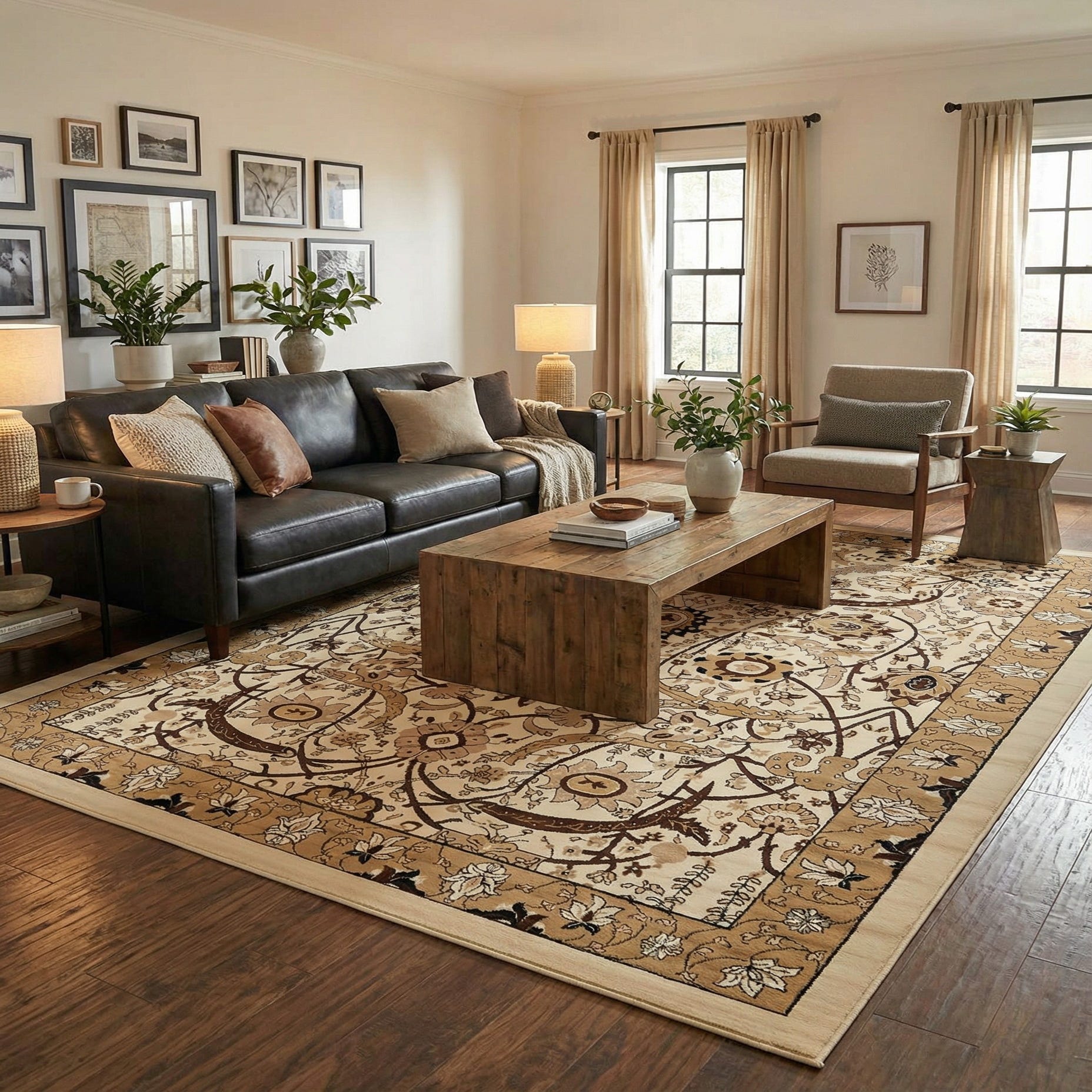 Primary color is Ivory. Colors in this rug include: Ivory, Beige, Black, Brown, Cream, Tan.