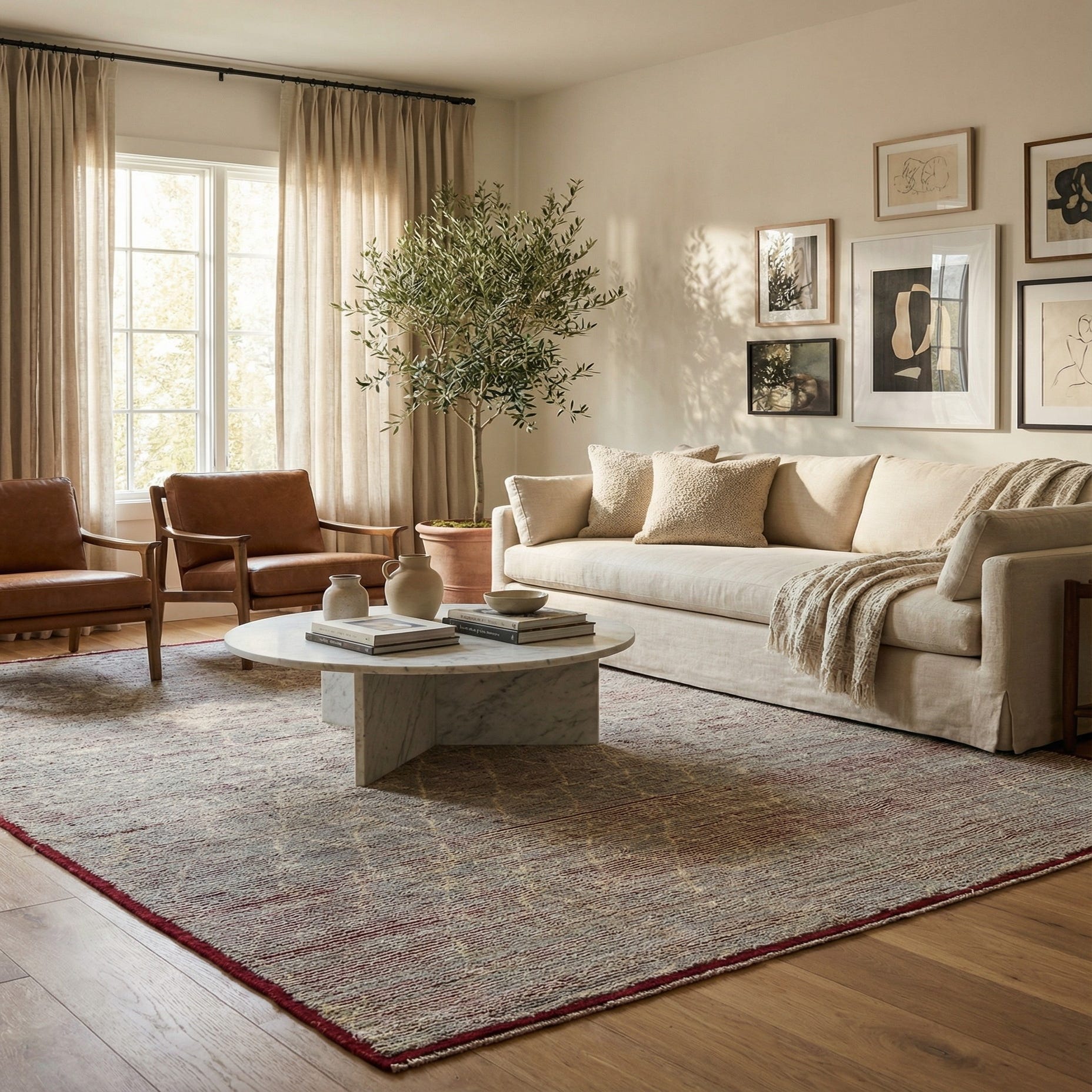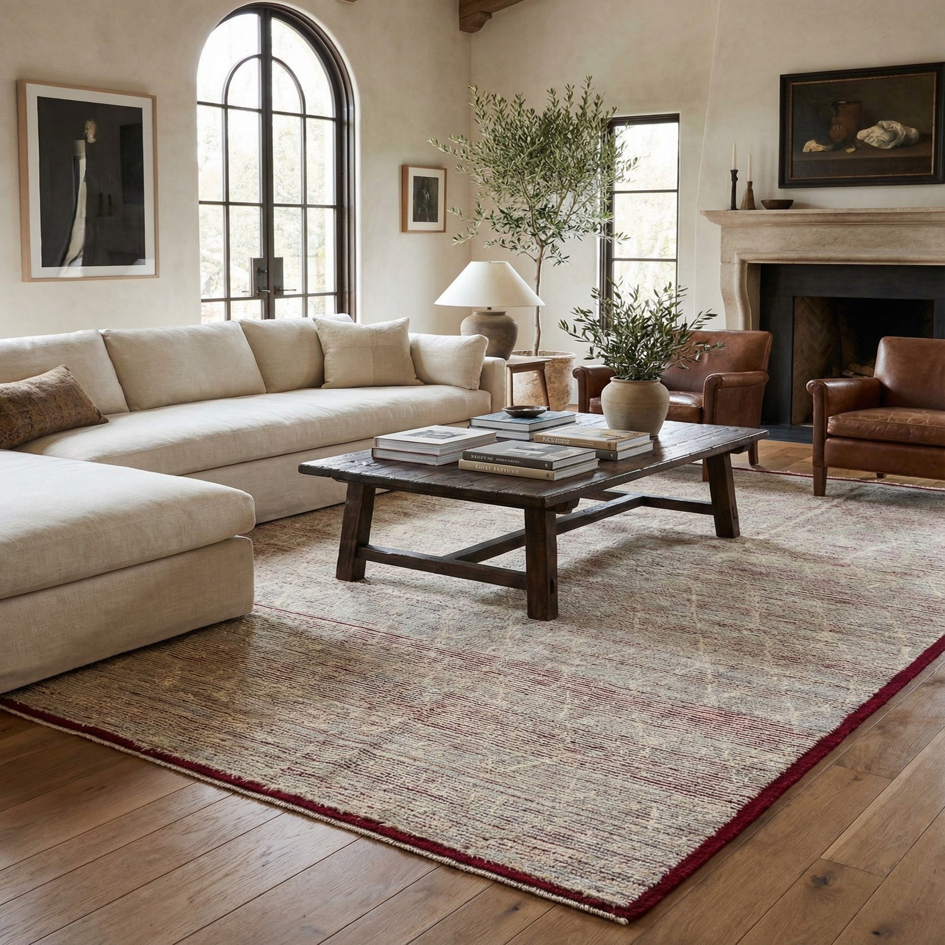 Primary color is Ivory. Colors in this rug include: Ivory, Beige, Burgundy.
