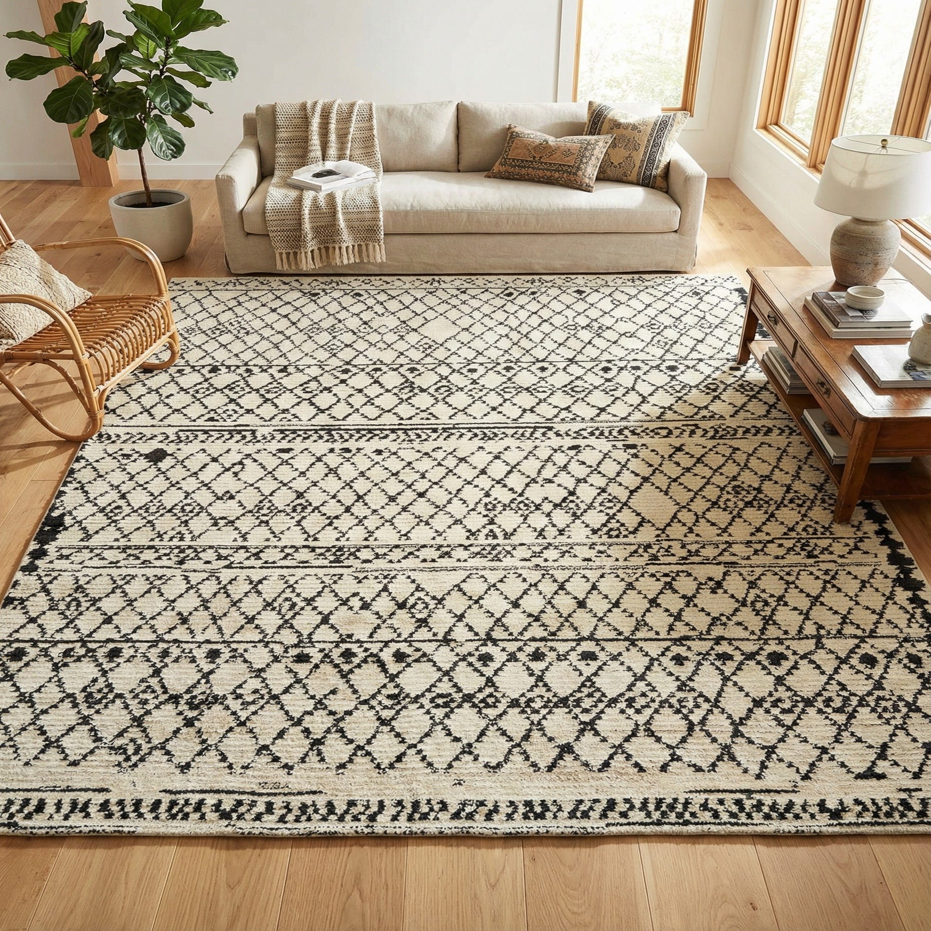 Primary color is Ivory. Colors in this rug include: Ivory, Black.