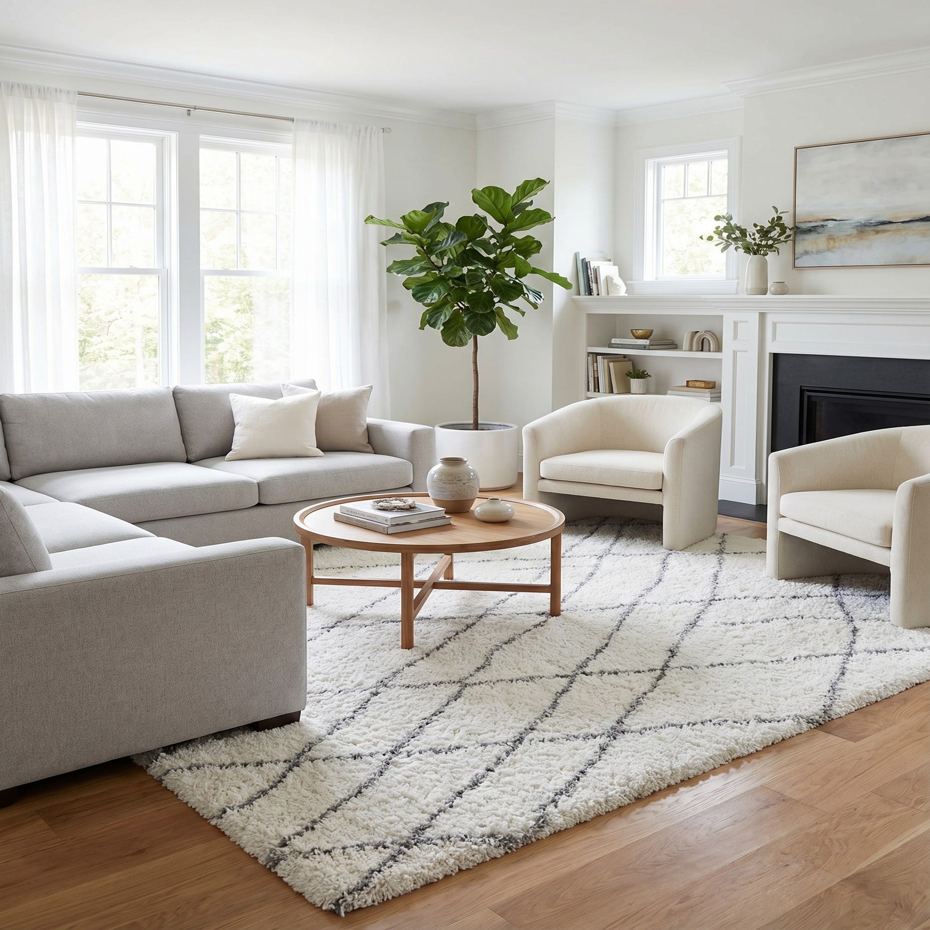 Bought this rug in the largest size for my living room. The turquoise works great with my decor and really tied all the areas together. Nice feeling shag color is not as bright as it appeared.