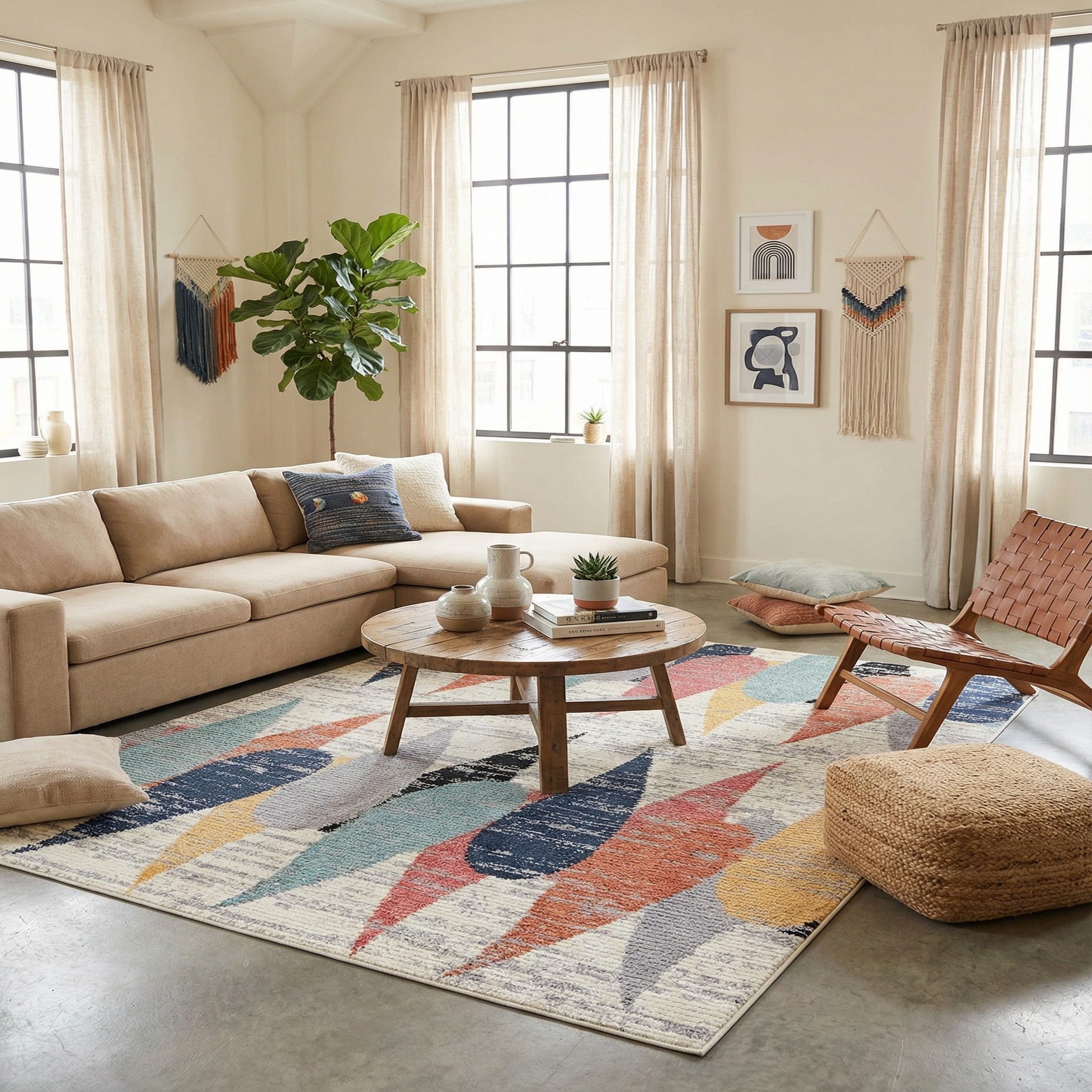 Primary color is Ivory. Colors in this rug include: Ivory, Black, Gray, Light Blue, Navy Blue, Orange, Rust Red.