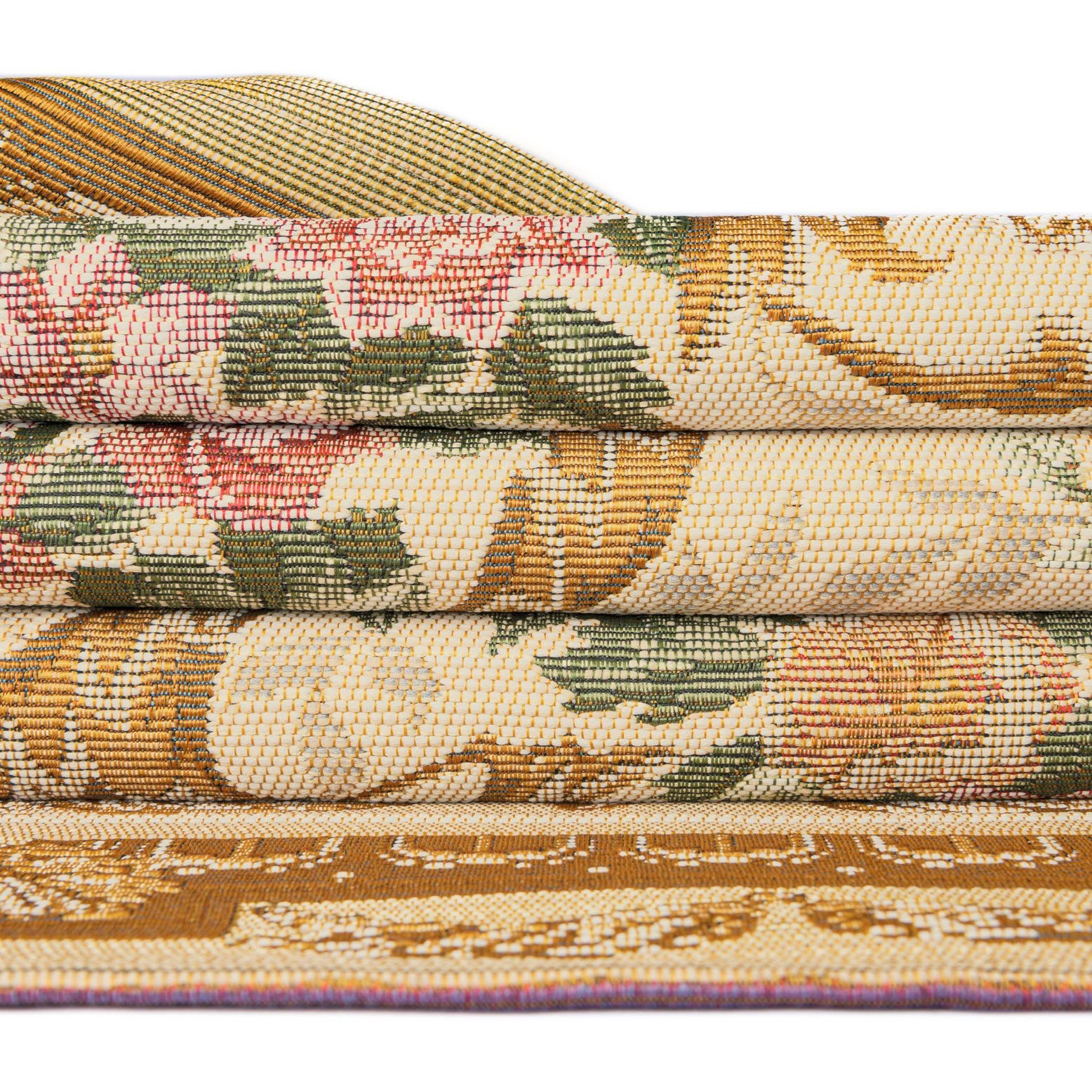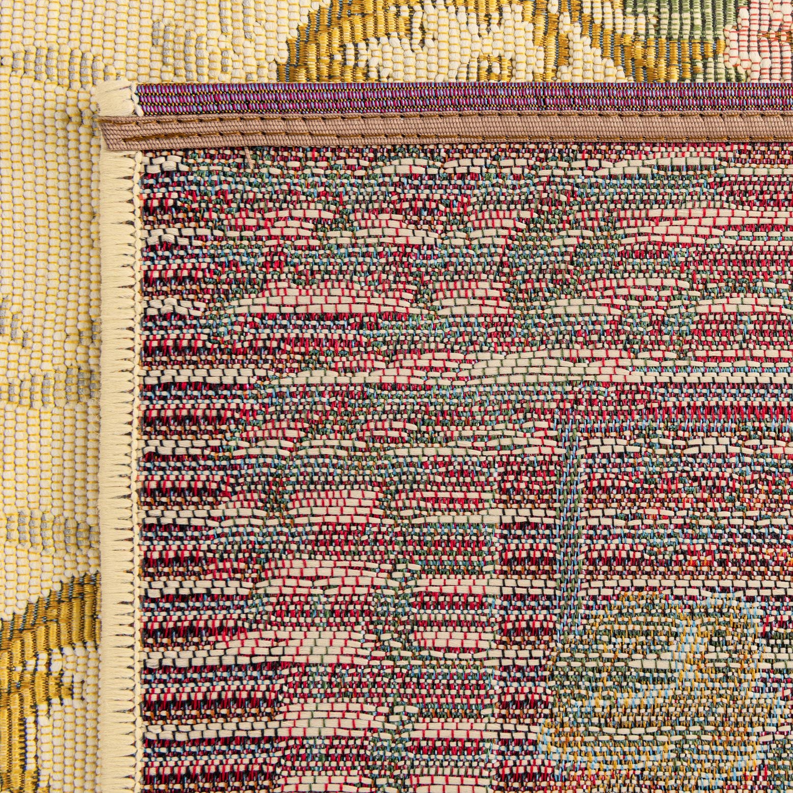 Primary color is Ivory and Beige. Colors in this rug include: Ivory and Beige, Gold, Green, Ivory, Light Blue, Red, Pink.