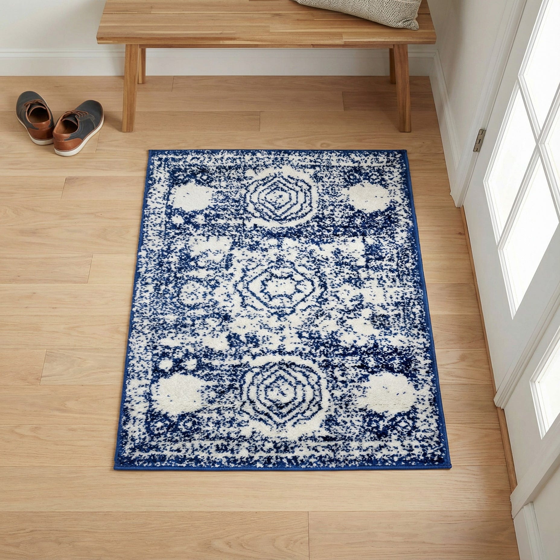 Primary color is Ivory and Blue. Colors in this rug include: Ivory and Blue, Blue, Ivory.
