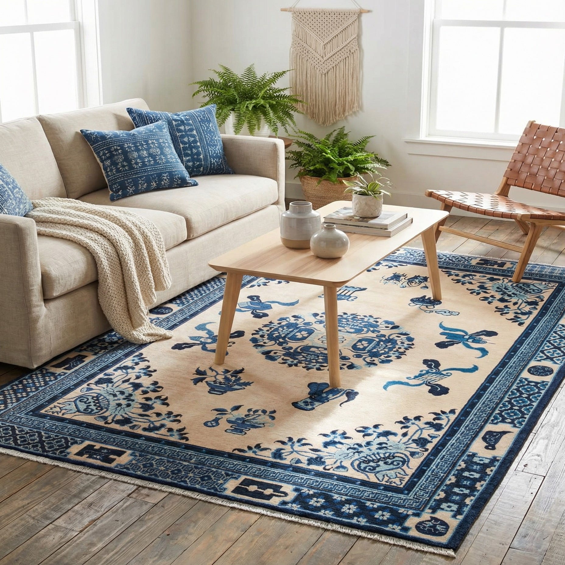 Primary color is Ivory and Blue. Colors in this rug include: Ivory and Blue, Navy Blue, Light Blue.