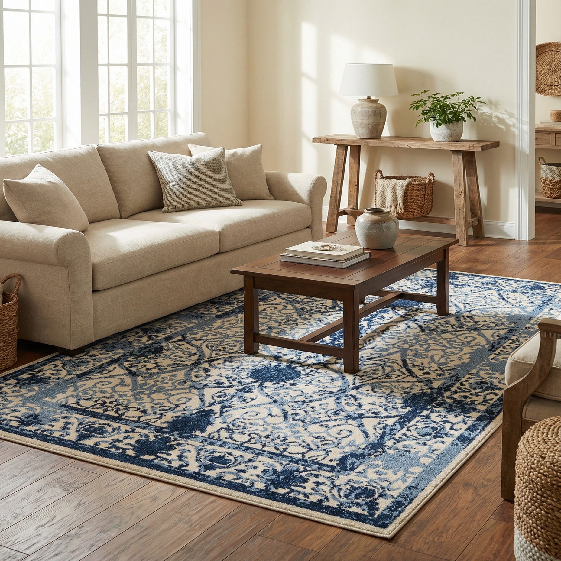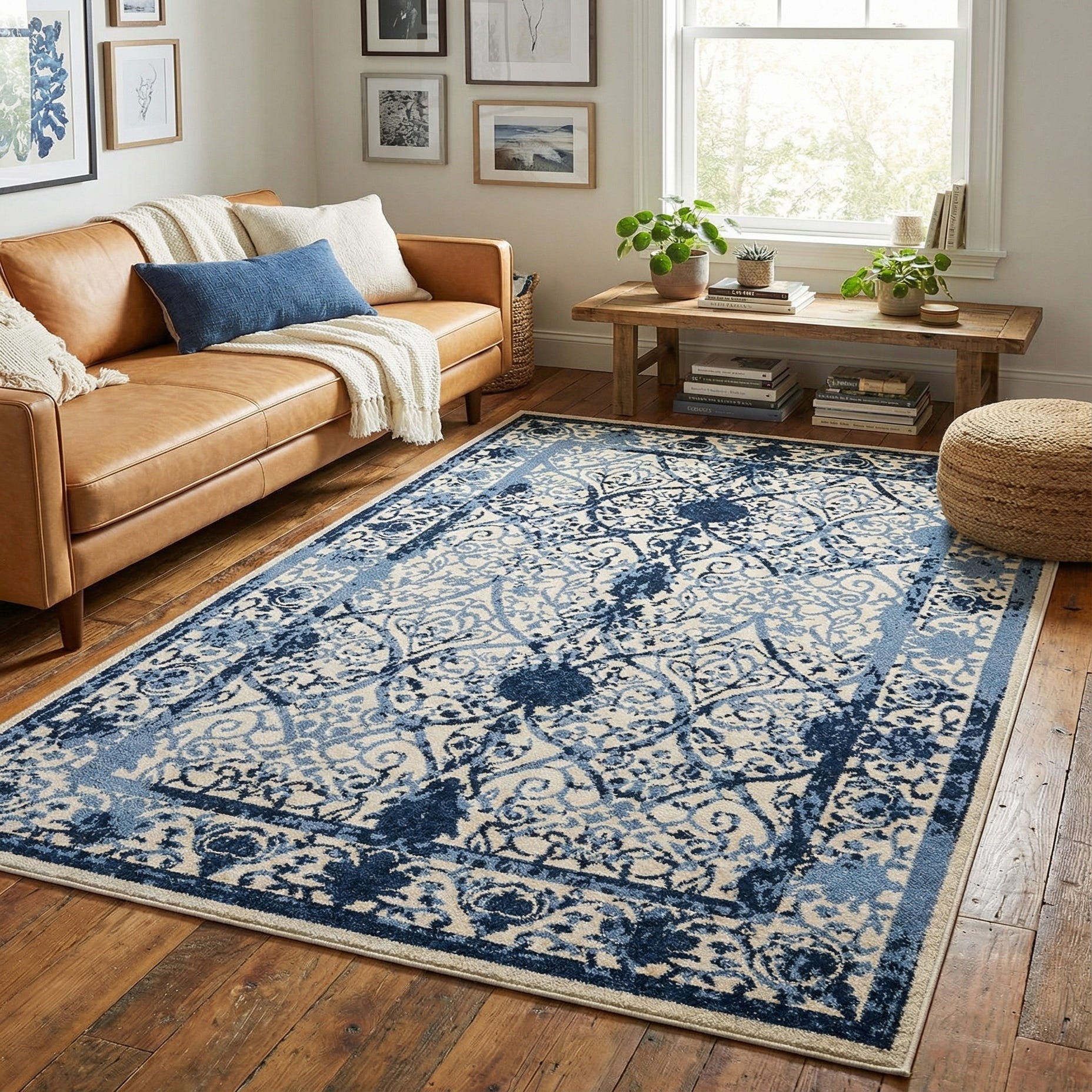Primary color is Ivory and Blue. Colors in this rug include: Ivory and Blue, Blue, Light Blue, Navy Blue.