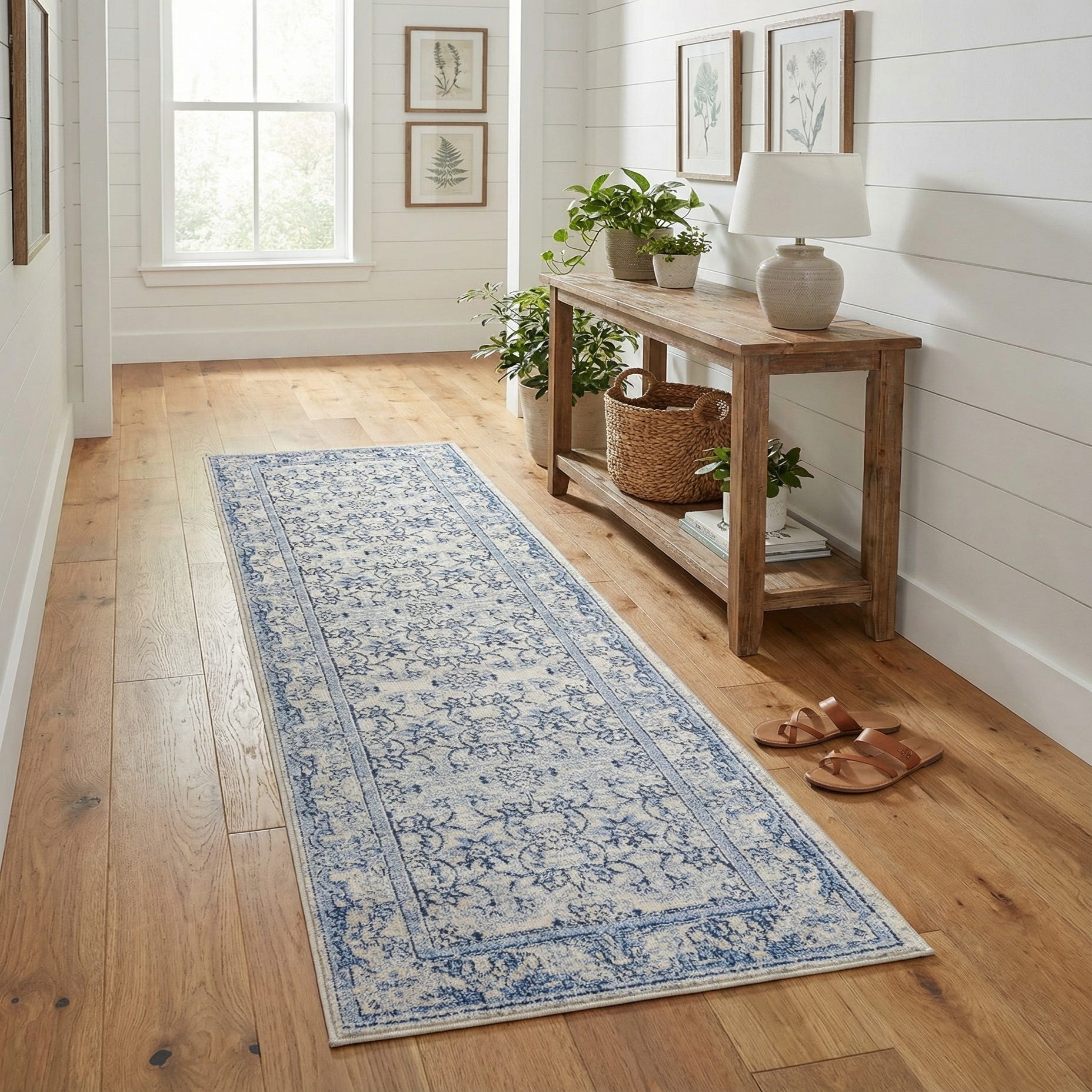 Primary color is Ivory Blue. Colors in this rug include: Ivory Blue, Beige, Blue, Light Blue, Ivory.
