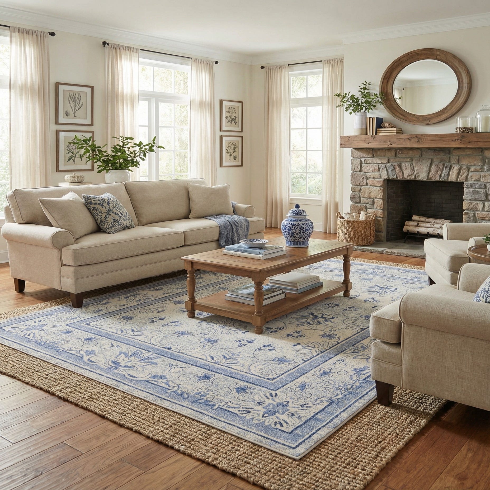 Primary color is Ivory Blue. Colors in this rug include: Ivory Blue, Beige, Blue, Light Blue, Ivory.
