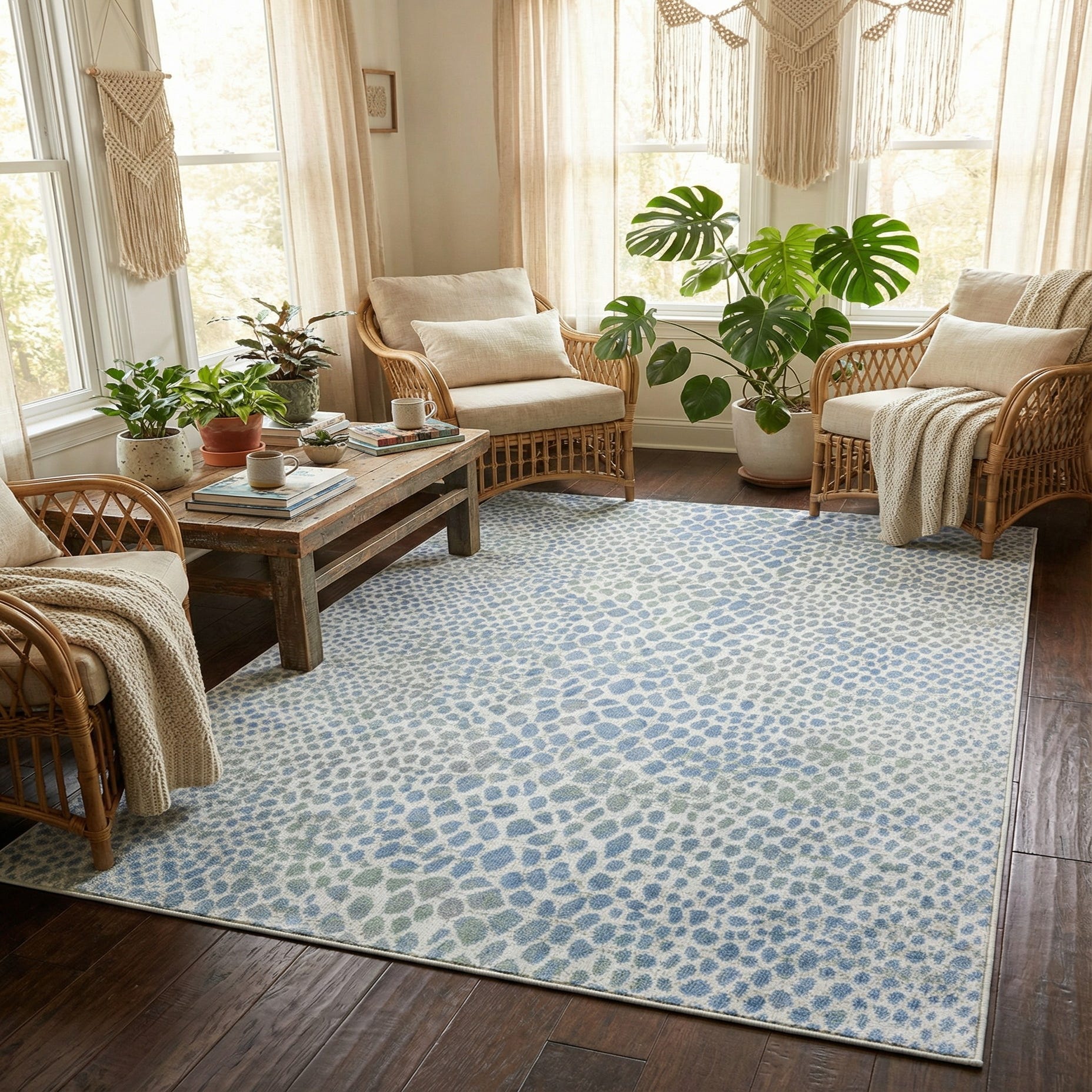 Primary color is Ivory Blue. Colors in this rug include: Ivory Blue, Gray.
