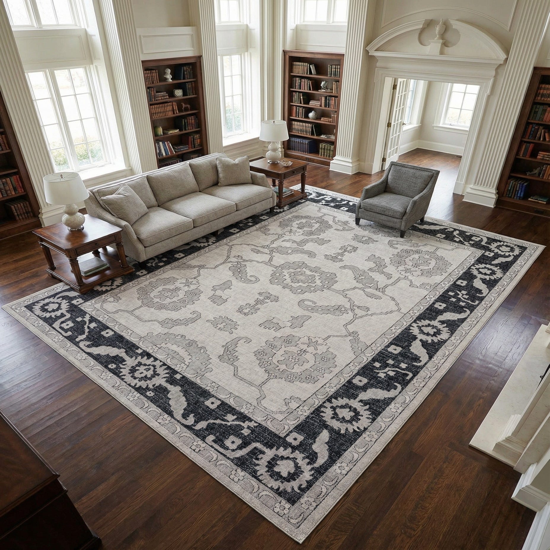 Primary color is Ivory Gray. Colors in this rug include: Ivory Gray, Black.