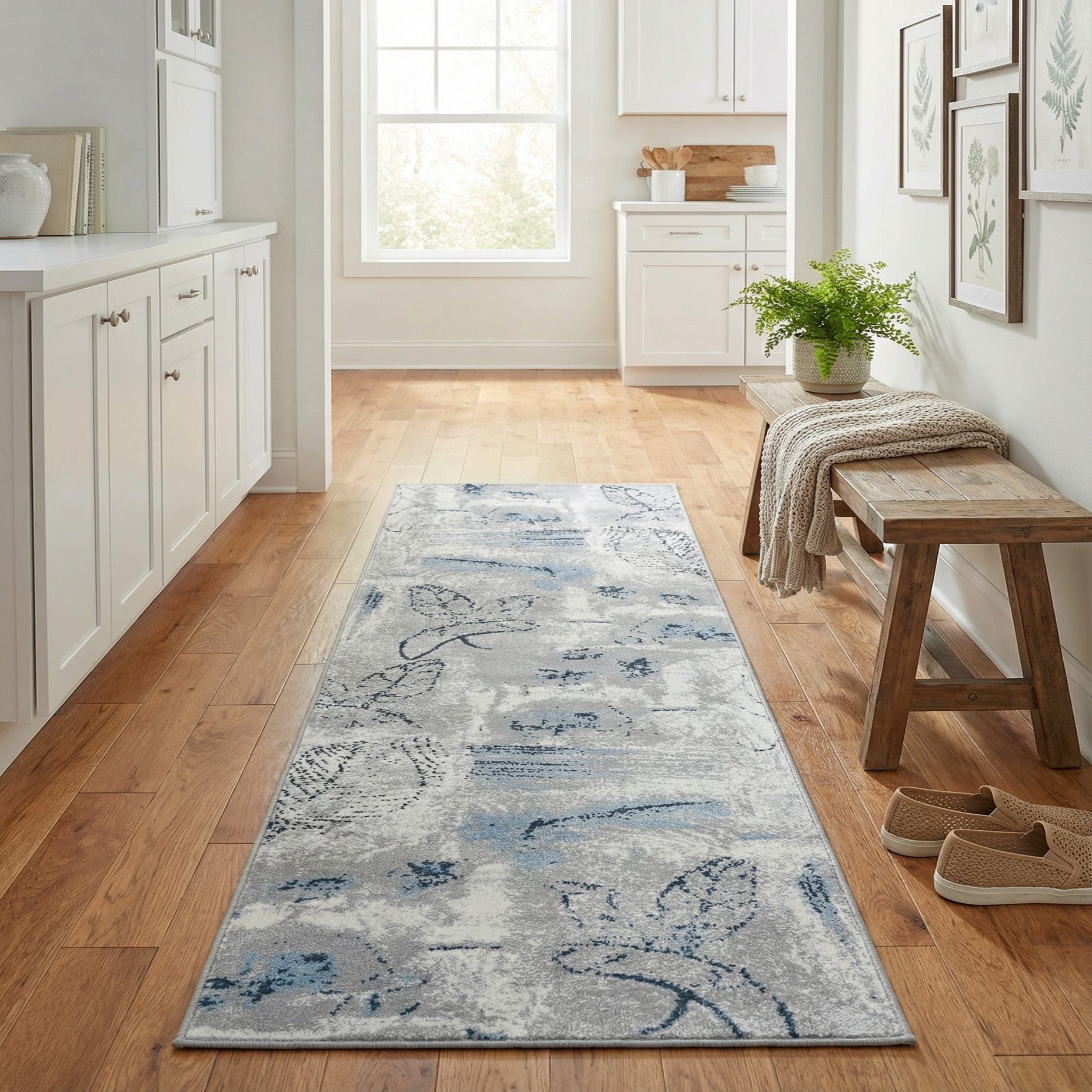 Primary color is Ivory Gray. Colors in this rug include: Ivory Gray, Blue, Light Blue.