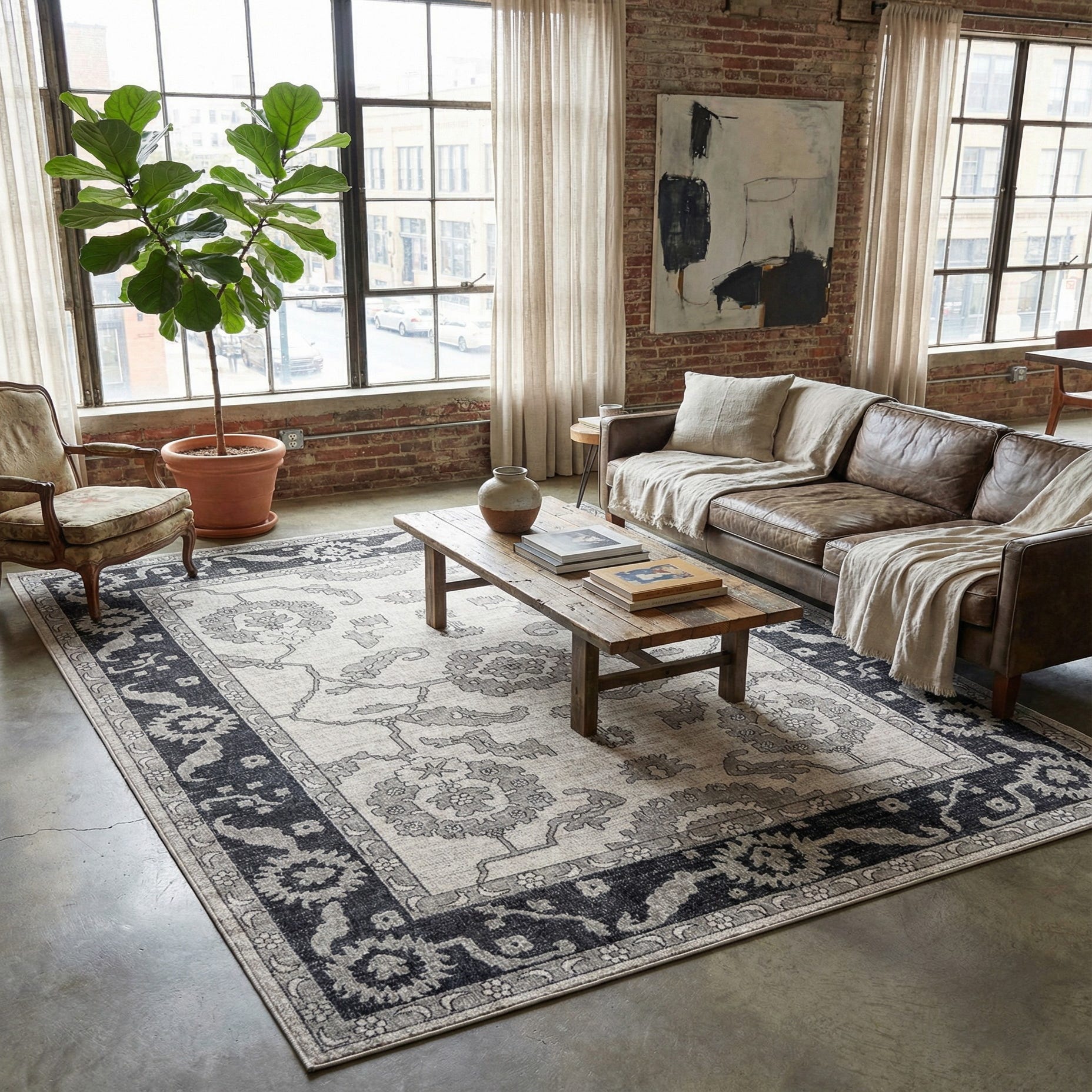 Primary color is Ivory Gray. Colors in this rug include: Ivory Gray, Black.