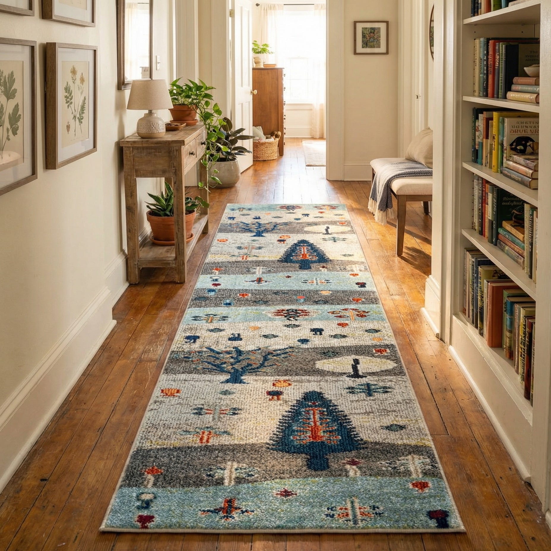Primary color is Ivory Gray Blue. Colors in this rug include: Ivory Gray Blue, Light Blue, Navy Blue, Peach, Orange, Yellow, Red.