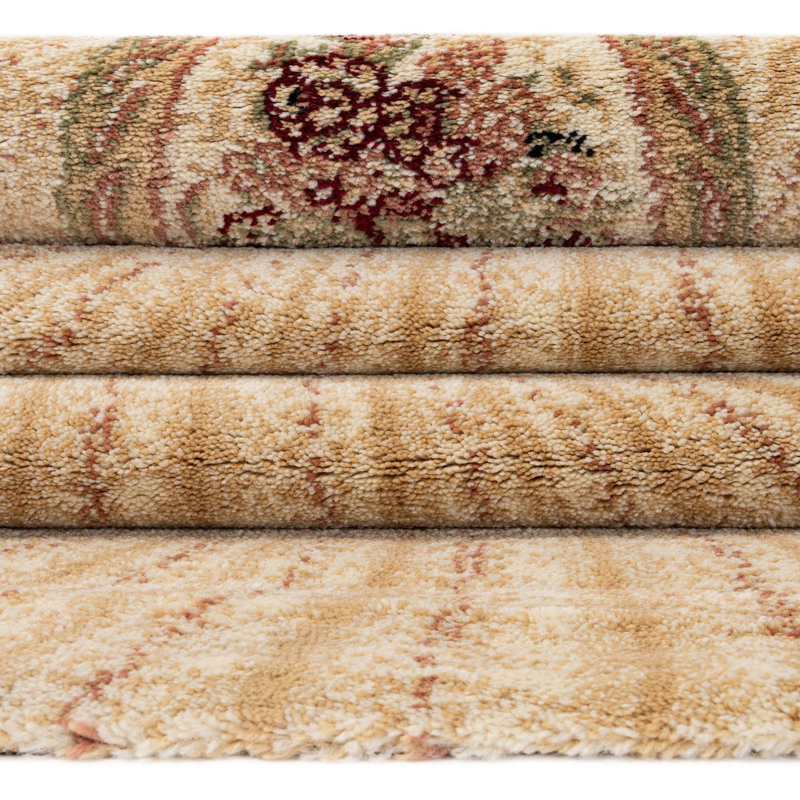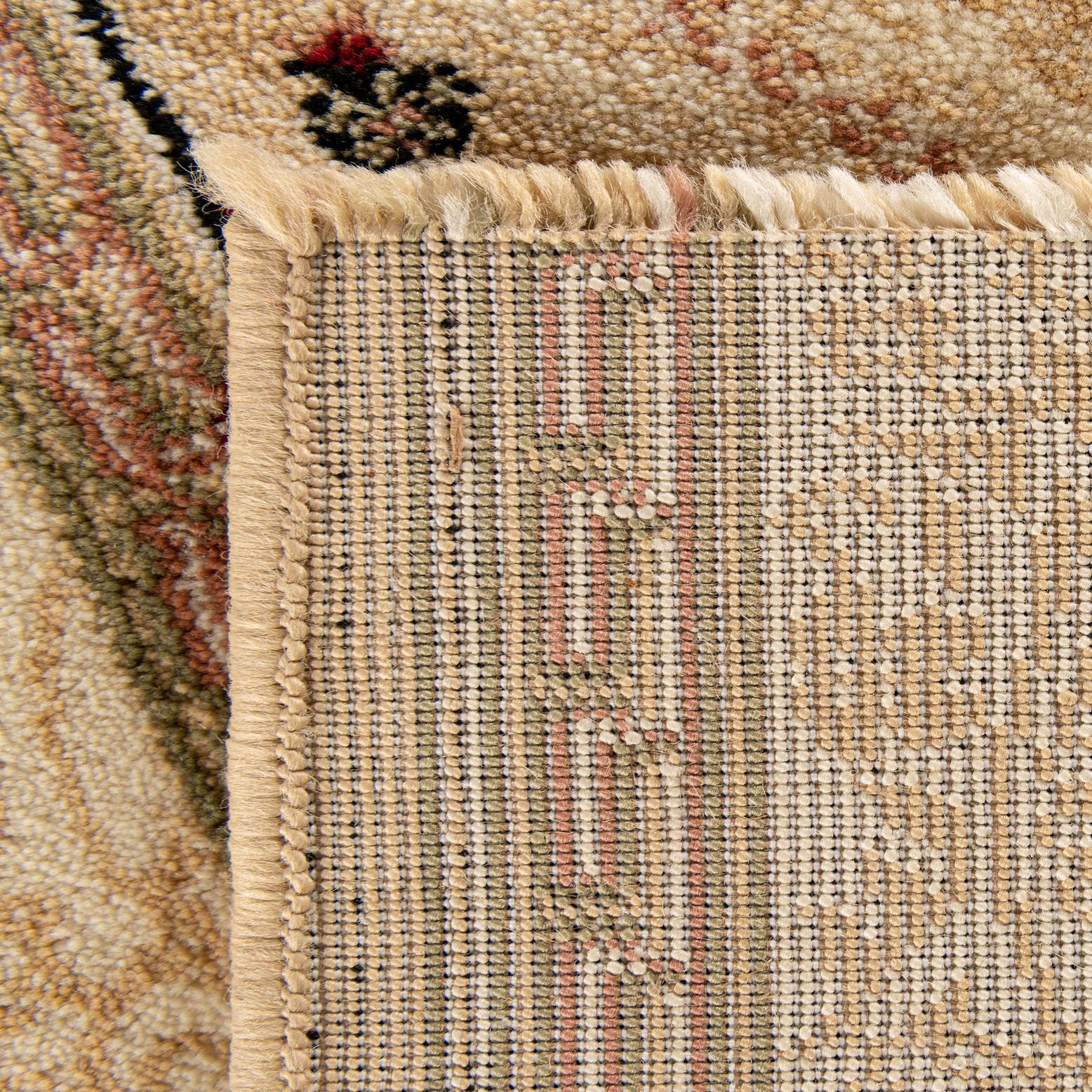 Primary color is Ivory. Colors in this rug include: Ivory, Beige, Black, Burgundy, Green, Tan, Salmon.