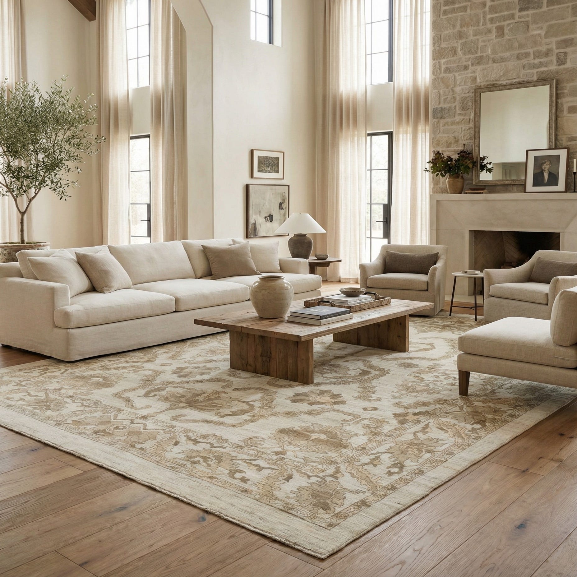 Primary color is Ivory. Colors in this rug include: Ivory, Beige, Brown, Cream, Light Brown, Peach, Olive.