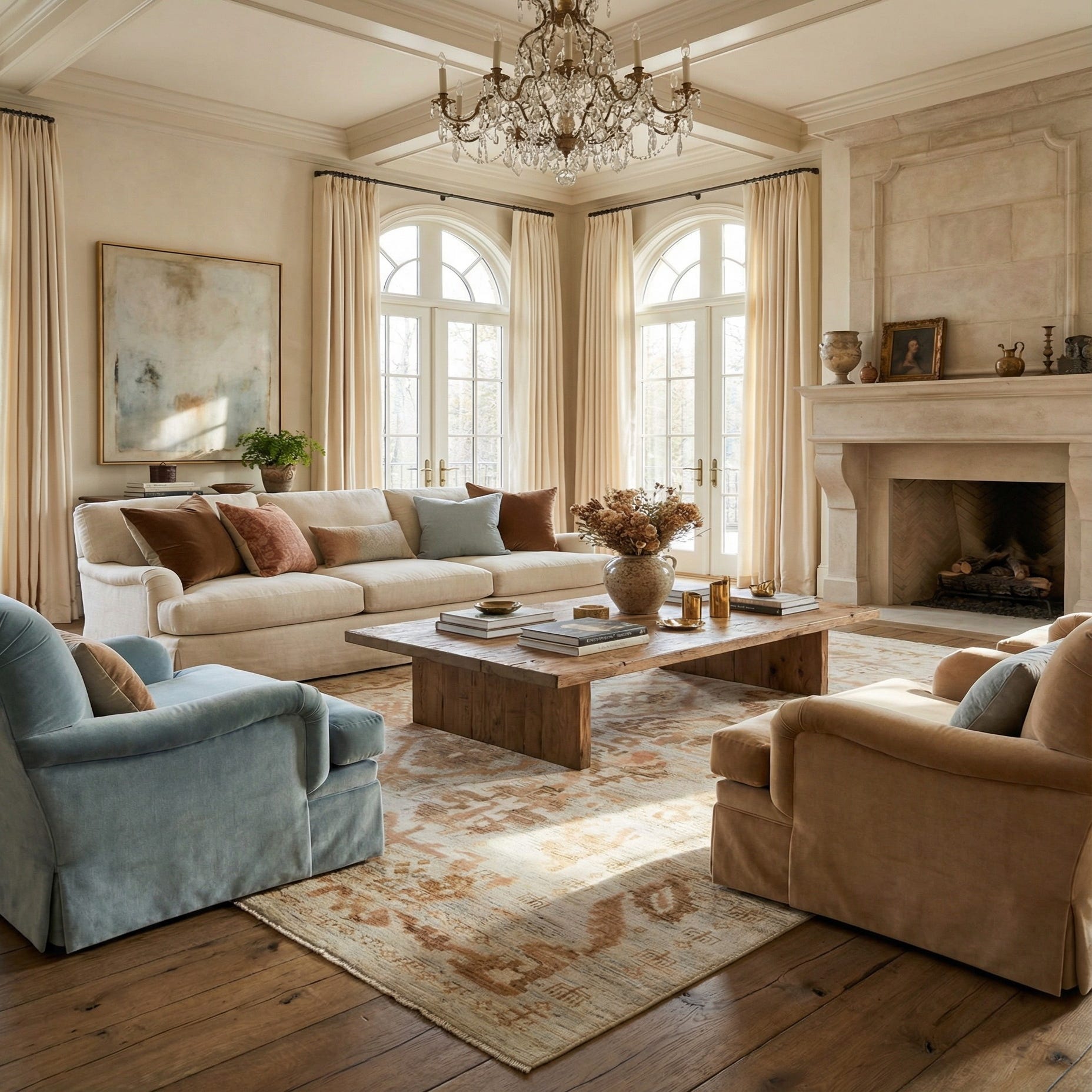Primary color is Ivory. Colors in this rug include: Ivory, Brown, Cream, Tan, Peach, Olive, Light Blue.