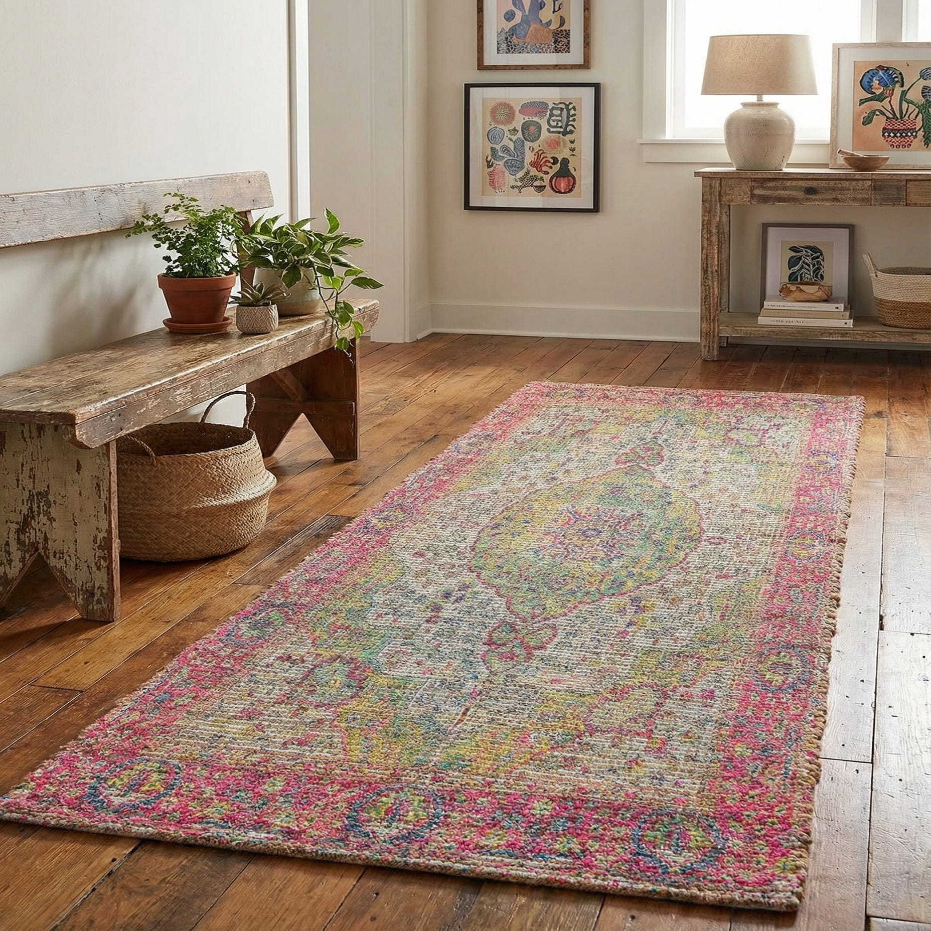 Primary color is Ivory Pink. Colors in this rug include: Ivory Pink, Navy Blue, Yellow, Pink, Green.