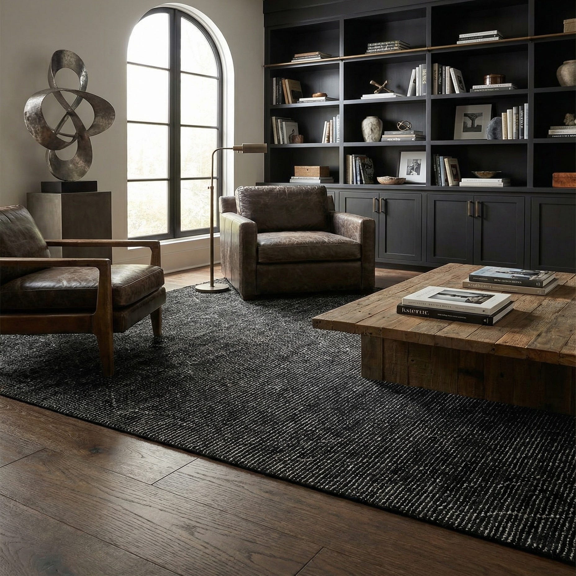 Primary color is Jet Black. Colors in this rug include: Jet Black, Ivory.