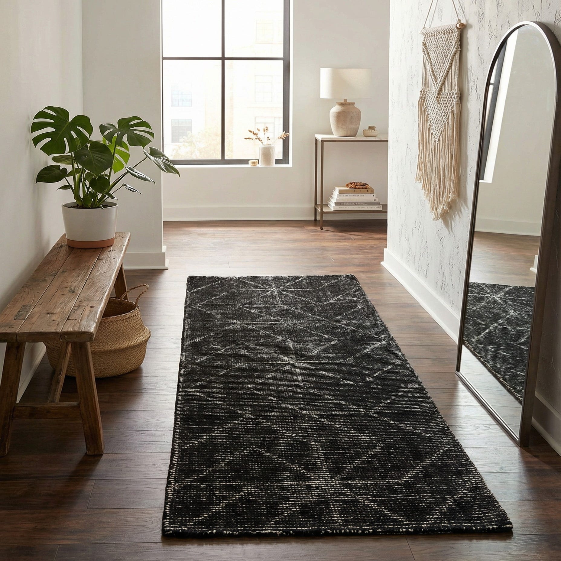 Primary color is Jet Black. Colors in this rug include: Jet Black, Ivory.