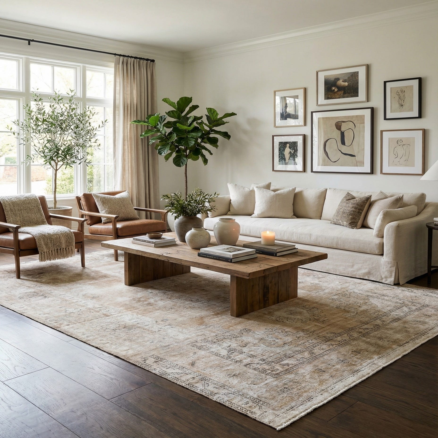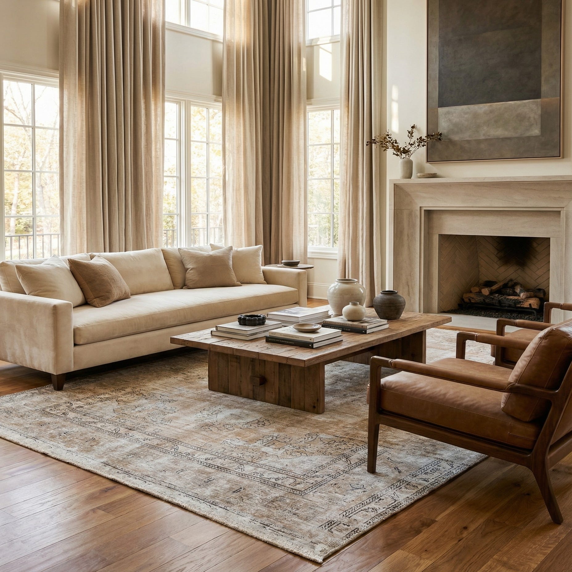 Primary color is Khaki. Colors in this rug include: Khaki, Black, Brown, Ivory.