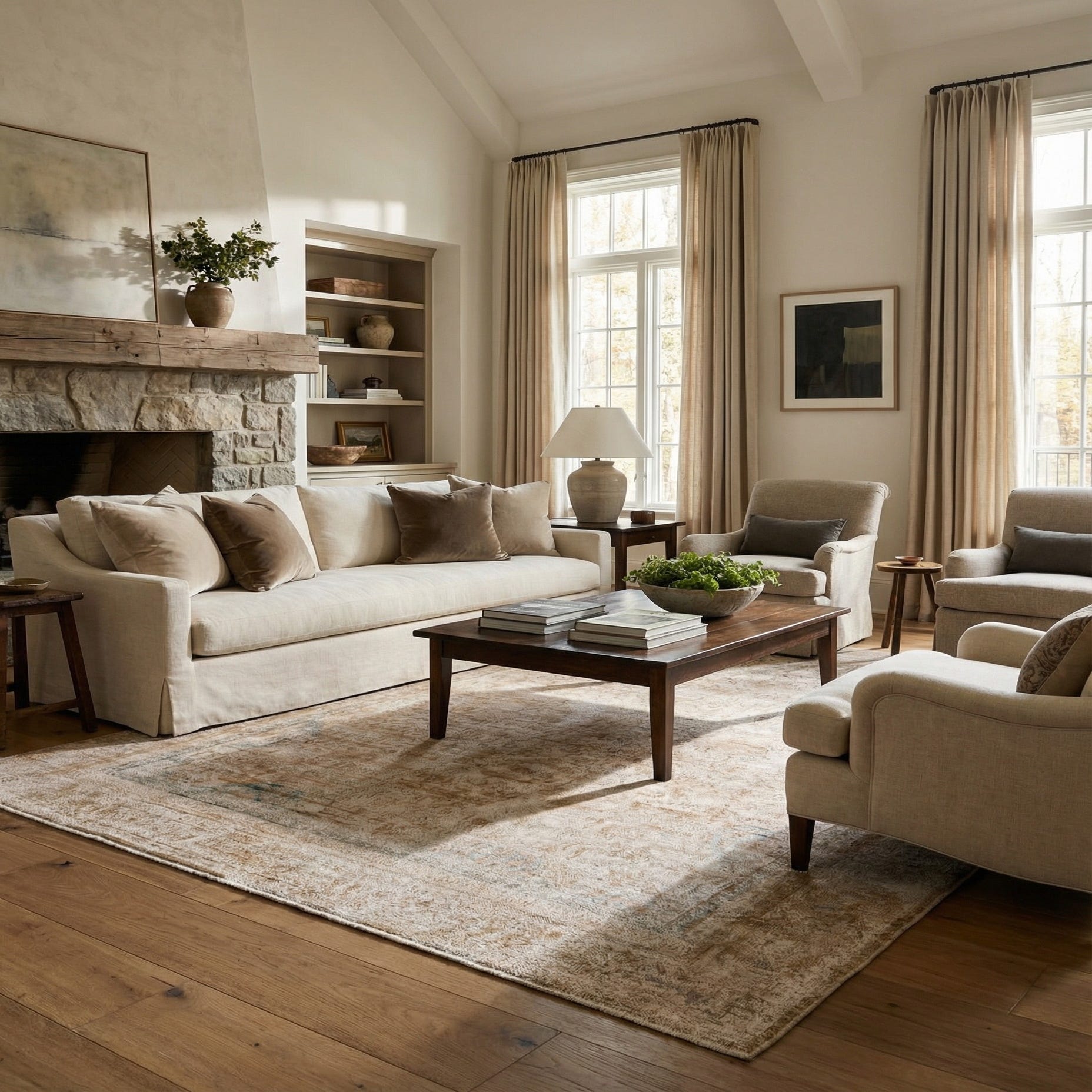 Primary color is Khaki. Colors in this rug include: Khaki, Beige, Peach, Green.